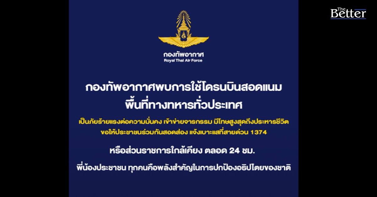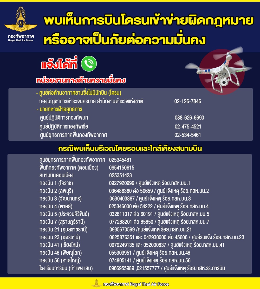 ปัจจุบัน สถานการณ์ความขัดแย้งระหว่างไทย กัมพูชา ยังคงต้องเฝ้าระวัง โดรนคือภัยคุกคามที่ร้ายแรงและส่งผลกระทบต่อความมั่นคงและชีวิตประชาชน กองทัพอากาศจึงขอความร่วมมือประชาชนทุกท่านที่พบเห็นหรือทราบเบาะแสเกี่ยวกับการบินของโดรน รวมทั้งผู้ที่บังคับโดรน ที่อาจฝ่าฝืนกฎหมายได้แจ้งสายด่วนความมั่นคง 1374 หรือหน่วยงานราชการใกล้เคียง ได้ตลอด 24 ชม.