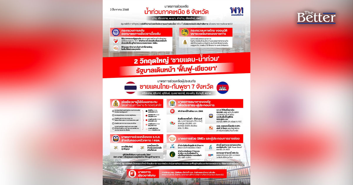 เพจเฟซบุ๊กพรรคเพื่อไทย โพสต์ข้อมูลการมาตรการช่วยเหลือเยียวยาของรัฐบาล ในสองสถานการณ์สำคัญที่ประเทศกำลังเผชิญว่า ในห้วงเวลาที่ประเทศไทยเผชิญทั้งภัยจากความตึงเครียดบริเวณชายแดนไทย–กัมพูชา และสถานการณ์อุทกภัยในภาคเหนือ รัฐบาลภายใต้การนำของพรรคเพื่อไทย ไม่ได้นิ่งนอนใจ เร่งออกมาตรการช่วยเหลือประชาชนอย่างรอบด้าน ทั้งการเยียวยาผู้ได้รับผลกระทบโดยตรง การบรรเทาความเดือดร้อนทางเศรษฐกิจ ไปจนถึงการฟื้นฟูสภาพความเป็นอยู่และกิจการของประชาชนในพื้นที่ประสบภัย