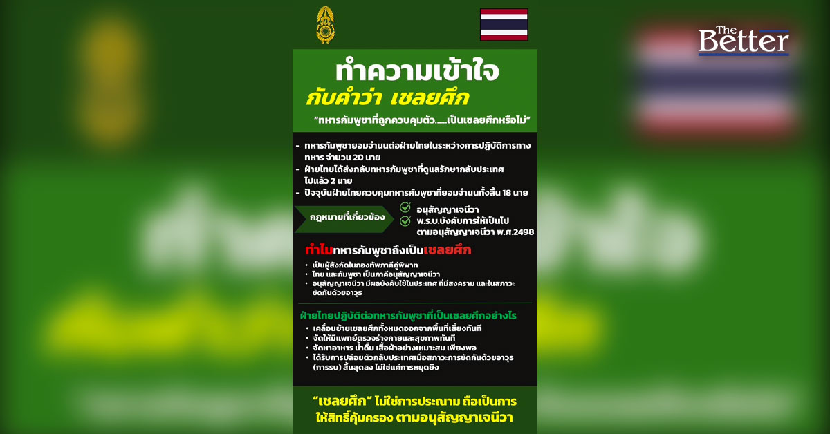 เพื่อให้เกิดความเข้าใจที่ถูกต้อง กองทัพบกขอชี้แจงว่า กำลังพลฝ่ายกัมพูชาที่ยอมจำนนและอยู่ในการควบคุมของฝ่ายไทย ได้รับการรับรองสถานะตามกฎหมายระหว่างประเทศว่าเป็น “เชลยศึก”
