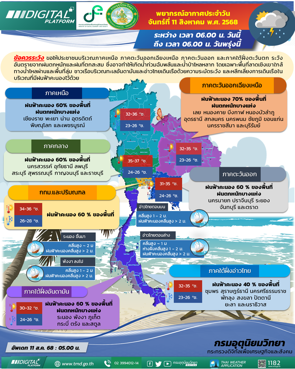 กรมอุตุนิยมวิทยา รายงาน ลักษณะอากาศทั่วไป ประจำวันที่ 11 สิงหาคม 2568 พยากรณ์อากาศ 24 ชั่วโมงข้างหน้า ภาคเหนือ ภาคตะวันออกเฉียงเหนือ ภาคตะวันออก และภาคใต้ฝั่งตะวันตก มีฝนตกหนักบางแห่ง ขอให้ประชาชนในบริเวณดังกล่าวระวังอันตรายจากฝนตกหนักและฝนที่ตกสะสม ซึ่งอาจทำให้เกิดน้ำท่วมฉับพลันและน้ำป่าไหลหลาก โดยเฉพาะพื้นที่ลาดเชิงเขาใกล้ทางน้ำไหลผ่านและพื้นที่ลุ่มไว้ด้วย เนื่องจากมีร่องมรสุมพาดผ่านประเทศลาวตอนบน และประเทศเวียดนามตอนบน ประกอบกับมรสุมตะวันตกเฉียงใต้ที่พัดปกคลุมทะเลอันดามัน ประเทศไทย และอ่าวไทยมีกำลังแรงขึ้น