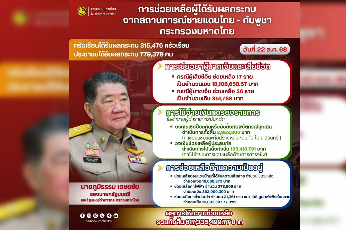 นายภูมิธรรม เวชยชัย รองนายกรัฐมนตรีและรัฐมนตรีว่าการกระทรวงมหาดไทย รักษาราชการแทนนายกรัฐมนตรี เปิดเผยว่า จากสถานการณ์การสู้รบตามแนวชายแดนไทย - กัมพูชา ซึ่งส่งผลกระทบต่อการดำเนินชีวิตของพี่น้องประชาชน โดยรัฐบาลได้มีการประกาศเขตการให้ความช่วยเหลือผู้ประสบภัยพิบัติกรณีฉุกเฉิน ฯ ในพื้นที่ 7 จังหวัดชายแดน 45 อำเภอ 336 ตำบล 4,081 หมู่บ้าน (จ.อุบลราชธานี ศรีสะเกษ สุรินทร์ บุรีรัมย์ สระแก้ว จันทบุรี และ จ.ตราด) เพื่อให้มีการเบิกจ่ายงบประมาณ ดำเนินการในส่วนต่างๆที่เกี่ยวข้องเพื่อช่วยเหลือเยียวยาประชาชนได้อย่าพงรวดเร็ว และครบถ้วน