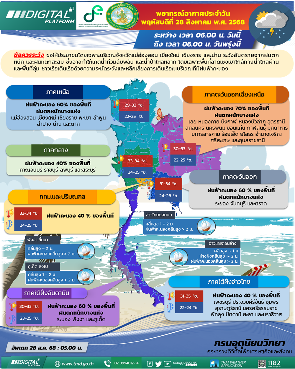 กรมอุตุนิยมวิทยา รายงาน ลักษณะอากาศทั่วไป ประจำวันที่ 28 สิงหาคม 2568 พยากรณ์อากาศ 24 ชั่วโมงข้างหน้า ประเทศไทยยังคงมีฝนฟ้าคะนอง และมีฝนตกหนักบางแห่ง ขอให้ประชาชนโดยเฉพาะบริเวณจังหวัดแม่ฮ่องสอน เชียงใหม่ เชียงราย และน่าน ระวังอันตรายจากฝนตกหนัก และฝนที่ตกสะสม ซึ่งอาจทำให้เกิดน้ำท่วมฉับพลัน และน้ำป่าไหลหลาก โดยเฉพาะพื้นที่ลาดเชิงเขาใกล้ทางน้ำไหลผ่านและพื้นที่ลุ่ม เนื่องจากร่องมรสุมพาดผ่านประเทศเมียนมา ตอนบนของภาคเหนือ เข้าสู่หย่อมความกดอากาศต่ำบริเวณประเทศลาว และเวียดนามตอนบน ประกอบกับมรสุมตะวันตกเฉียงใต้กำลังปานกลางพัดปกคลุมทะเลอันดามัน ประเทศไทย และอ่าวไทย