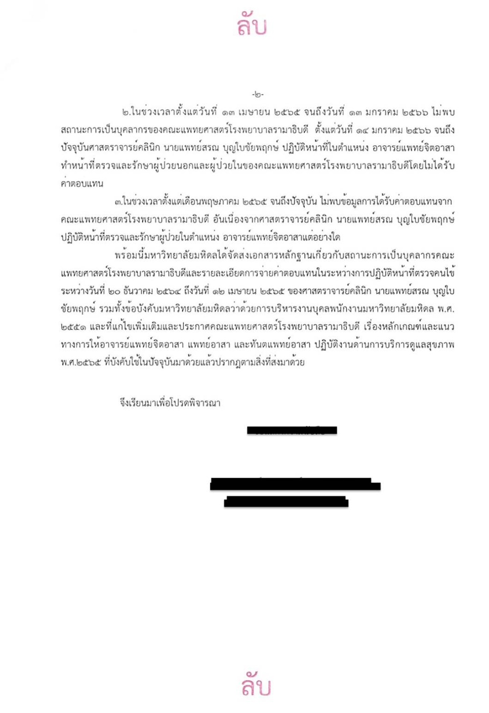 ผลการตรวจสอบ ยังระบุต่อมาว่า ตั้งแต่วันที่ 13 เมษายน 2565 ถึงวันที่ 13 มกราคม 2566 ไม่พบสถานะของ ศาสตราจารย์คลินิกนพ.สรณ เป็นบุคลากรของคณะแพทยศาสตร์ โรงพยาบาลรามาธิบดี และนับตั้งแต่วันที่ 14 มกราคม 2566 จนถึงปัจจุบัน ศาสตราจารย์คลินิกนพ.สรณ บุญใบชัยพฤกษ์ ปฏิบัติหน้าที่ในตำแหน่ง “อาจารย์แพทย์จิตอาสา” ทำหน้าที่ตรวจและรักษาผู้ป่วยนอกและผู้ป่วยในของคณะแพทยศาสตร์รพ.รามาธิบดี โดยไม่ได้รับค่าตอบแทน