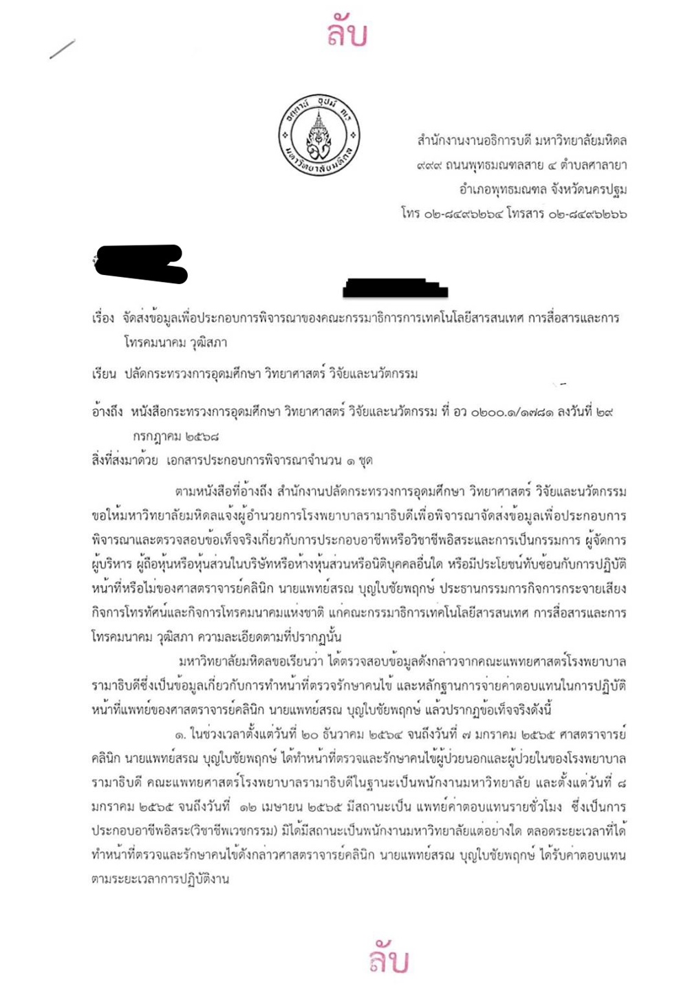 ตามที่ สำนักงานปลัดกระทรวงอุดมศึกษา วิทยาศาสตร์ วิจัยและนวัตกรรม มอบให้ มหาวิทยาลัยมหิดล ตรวจสอบข้อเท็จจริงกรณีที่ “คณะกรรมาธิการเทคโนโลยีสารสนเทศ การสื่อสาร และการโทรคมนาคม วุฒิสภา” (ชุดที่ผ่านมา) ซึ่งมี พล.อ.อนันตพร กาญจนรัตน์ เป็นประธาน กล่าวหา นพ.สรณ บุญใบชัยพฤกษ์ ประธานกสทช.ว่า “ขาดคุณสมบัติ” ยังมีสถานะเป็น “พนักงานมหาวิทยาลัย” ตรวจรักษาคนไข้ มิได้ลาออก ขัดต่อมาตรา 8 ของพ.ร.บ.องค์กรจัดสรรคลื่นความถี่ฯ พ.ศ. 2553 นั้น