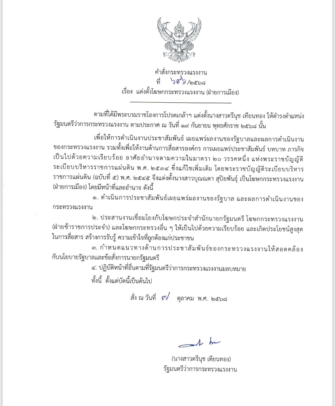 กระทรวงแรงงาน เผยแพร่คำสั่งที่ 696/2568 เรื่องแต่งตั้งโฆษกกระทรวงแรงงาน (ฝ่ายการเมือง) โดย น.ส.ตรีนุช เทียนทอง รัฐมนตรีว่าการกระทรวงแรงงาน ลงนามในคำสั่งเรื่องการแต่งตั้ง น.ส.บุณณดา สุปิยพันธุ์ เป็นโฆษกกระทรวงแรงงาน (ฝ่ายการเมือง) ซึ่งตำแหน่งดังกล่าวมีอำนาจหน้าที่ดำเนินการประชาสัมพันธ์เผยแพร่ผลงานของรัฐบาล และดำเนินงานของกระทรวงแรงงาน ประสานงานเชื่อมโยงกับโฆษกประจำสำนักนายกรัฐมนตรี