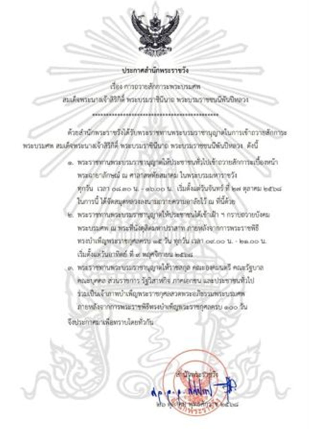 ด้วยสำนักพระราชวังได้รับพระราชทานพระบรมราชานุญาตในการเข้าถวายสักการะพระบรมศพ สมเด็จพระนางเจ้าสิริกิติ์ พระบรมราชินีนาถ พระบรมราชชนนีพันปีหลวง ดังนี้