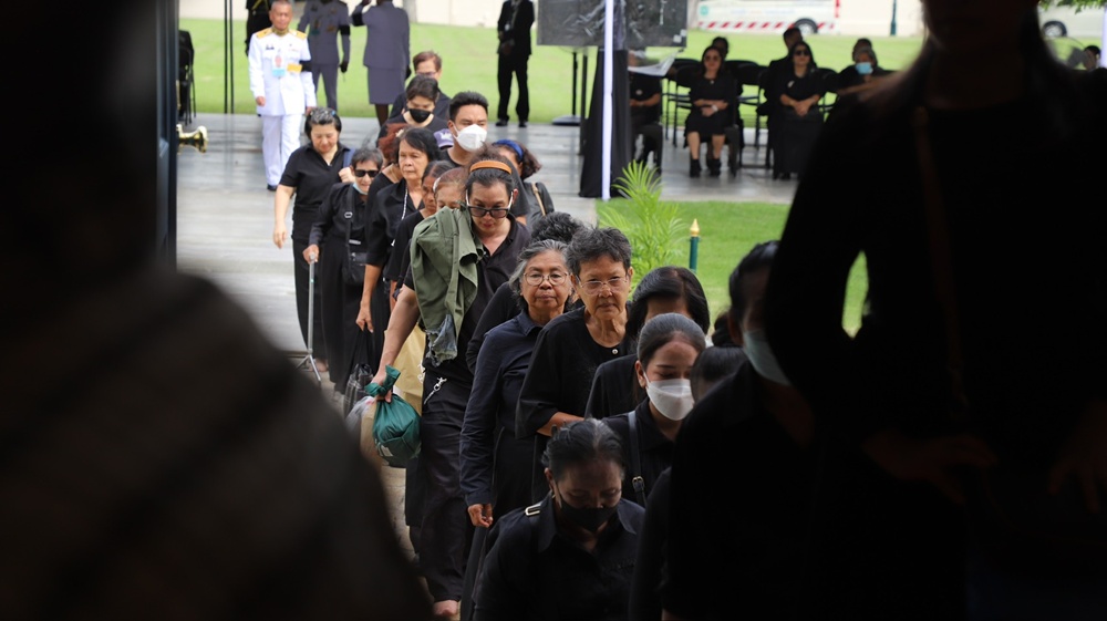 ปชช. พร้อมใจแต่งกายชุดดำสุภาพ เดินทางมายังพระบรมมหาราชวัง เพื่อถวายสักการะพระบรมศพ สมเด็จพระบรมราชชนนีพันปีหลวง เบื้องหน้าพระฉายาลักษณ์ ณ ศาลาสหทัยสมาคม โดยมี จนท.จัดระเบียบอำนวยความสะดวกตลอดเส้นทาง