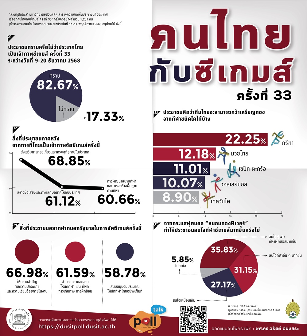 “สวนดุสิตโพล” มหาวิทยาลัยสวนดุสิต สำรวจความคิดเห็นประชาชนทั่วประเทศ เรื่อง “คนไทยกับซีเกมส์ครั้งที่ 33” กลุ่มตัวอย่าง จำนวน 1,281 คน (สำรวจทางออนไลน์และภาคสนาม) ระหว่างวันที่ 11-14 พ.ย. 2568 พบว่า กลุ่มตัวอย่างร้อยละ 82.67 ทราบว่าประเทศไทยเป็นเจ้าภาพซีเกมส์ครั้งที่ 33 โดยคาดหวังว่าจะช่วยส่งเสริมการท่องเที่ยวและเศรษฐกิจภายในประเทศ ร้อยละ 68.85 กีฬาที่คิดว่าทีมไทยจะคว้าเหรียญทองมาได้คือ กรีฑา ร้อยละ 22.25 รองลงมาคือ มวยไทย ร้อยละ 12.18 สิ่งที่อยากฝากบอกรัฐบาลในการจัดซีเกมส์คือ ให้ความสำคัญกับความปลอดภัยและความเรียบร้อยภายในงาน ร้อยละ 66.98 จากกระแสฟุตบอล “หมอนทองฟีเวอร์” ส่วนหนึ่งทำให้สนใจซีเกมส์มากขึ้น โดยเฉพาะในกีฬา ฟุตบอล ร้อยละ 35.83 และกีฬาอื่น ๆ ร้อยละ 31.15