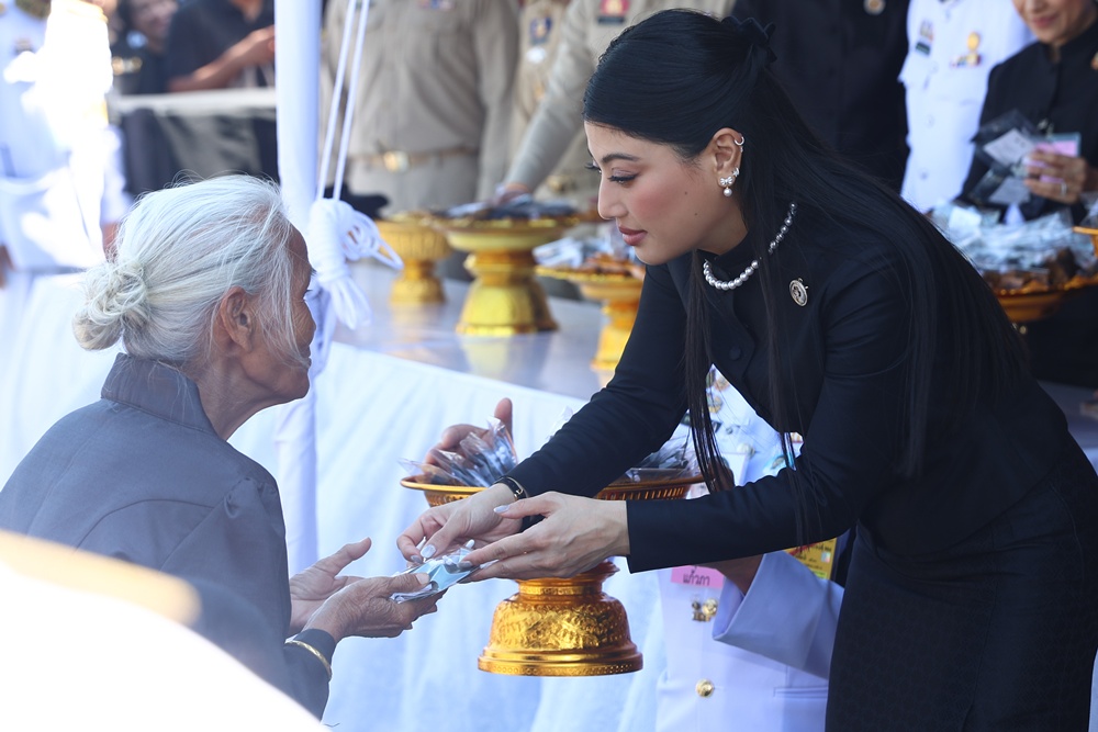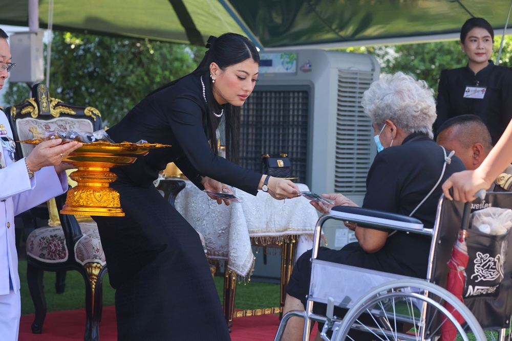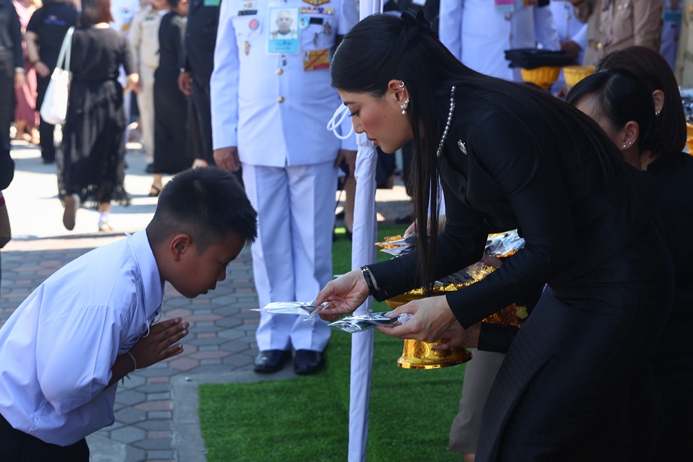 การนี้ ถวายพวงมาลัย ถวายราชสักการะพระบรมฉายาลักษณ์ พระบาทสมเด็จพระบรมชนกาธิเบศร มหาภูมิพลอดุลยเดชมหาราช บรมนาถบพิตร และเสด็จพระดำเนินไปยังจุดพระราชทานสิ่งของฯ เพื่อพระราชทานเข็มกลัดโบว์ดำแก่ประชาชนที่เดินทางมาถวายความอาลัยฯ โดยเป็นเข็มกลัดโบว์ดำ 2 แบบ แบบที่ 1 เข็มกลัดโบว์ดำดอกไม้ในพระนามาภิไธย 'โมกราชินี' แบบที่ 2 เข็มกลัดโบว์ดำพรรณไม้พระราชทาน 'มณีเทวา' มีชื่อสามัญ หรือชื่อทั่วไปว่า ดอกกระดุมเงิน บางพื้นที่เรียก หญ้าหัวหงอก