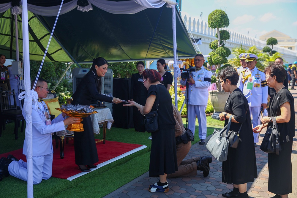 16 พฤศจิกายน 2568 เวลา 11.49 น. ภายหลังจากที่สมเด็จพระเจ้าลูกเธอ เจ้าฟ้าสิริวัณณวรี นารีรัตนราชกัญญา ทรงบำเพ็ญพระราชกุศลถวายพระบรมศพ สมเด็จพระนางเจ้าสิริกิติ์ พระบรมราชินีนาถ พระบรมราชชนนีพันปีหลวง ทรงถวายภัตตาหารเพล แด่พระสงฆ์ ณ พระที่นั่งดุสิตมหาปราสาท ในพระบรมมหาราชวัง แล้ว ได้เสด็จไปประทับรถยนต์พระที่นั่ง ไปยังประตูมณีนพรัตน์ ณ แท่นพระบรมฉายาลักษณ์ พระบาทสมเด็จพระบรมชนกาธิเบศร มหาภูมิพลอดุลยเดชมหาราช บรมนาถบพิตร เพื่อพระราชทานเข็มกลัดริบบิ้น หรือโบว์ดำแก่ประชาชนที่เดินทางเข้าเฝ้าฯ ถวายความอาลัย สมเด็จพระนางเจ้าสิริกิติ์ พระบรมราชินีนาถ พระบรมราชชนนีพันปีหลวง ณ พระที่นั่งดุสิตมหาปราสาท ในพระบรมมหาราชวัง
