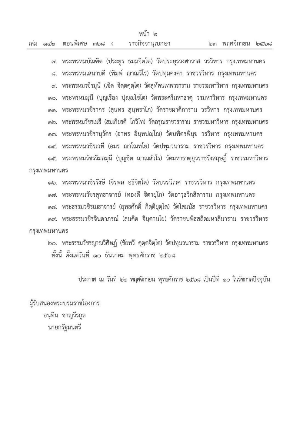 เว็บไซต์ ราชกิจจานุเบกษา ประกาศแต่งตั้งกรรมการมหาเถรสมาคม โดยมี นายอนุทิน ชาญวีรกูล นายกรัฐมนตรี เป็นผู้รับสนองพระบรมราชโองการ โดยระบุว่า