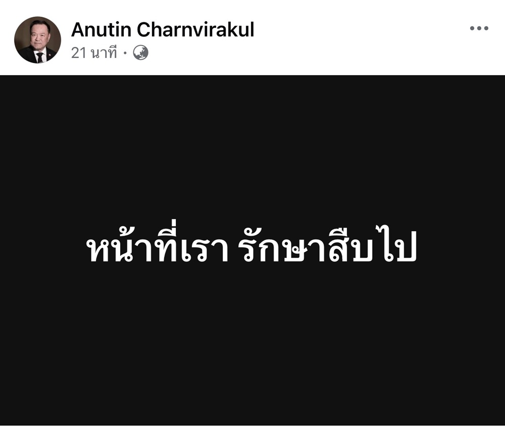 นายอนุทิน ชาญวีรกูล นายกรัฐมนตรีและรมว.มหาดไทย โพสต์ข้อความผ่านเฟซบุ๊กระบุว่า “หน้าที่เรา รักษาสืบไป” ผู้สื่อข่าวรายงานว่า ข้อความดังกล่าวเป็นท่องหนึ่งของเพลงพระราชนิพนธ์ “เราสู้” ของรัชกาลที่ 9 ซึ่งเป็นเพลงปลุกใจที่ทรงพระราชทานเป็นของขวัญปีใหม่ให้แก่ทหาร อาสาสมัคร และตำรวจชายแดน