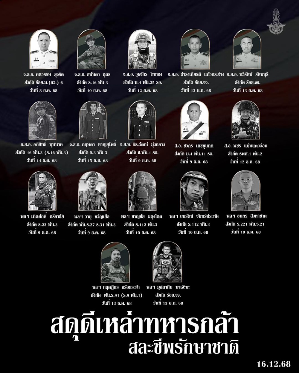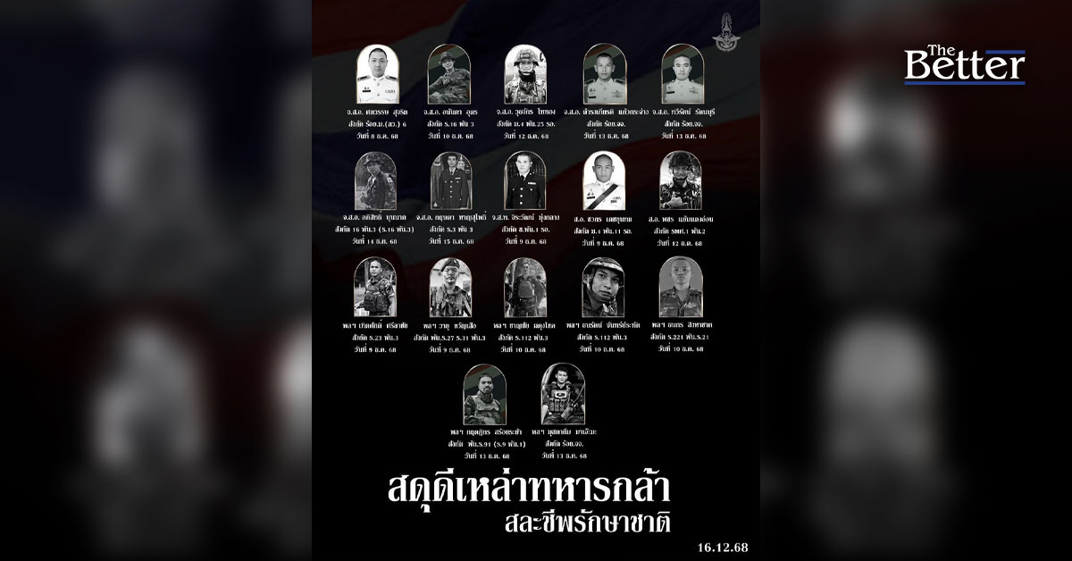 กองทัพไทย สดุดีเหล่าทหารกล้า ผู้สละชีพเพื่อปกป้องแผ่นดินไทย สรุปยอด ทหารไทยเสียชีวิต 17 นาย รายล่าสุด "จ.ส.อ กฤษฎา หาญสุโพธิ์" พลีชีพขณะสู้รบชายแดนบุรีรัมย์