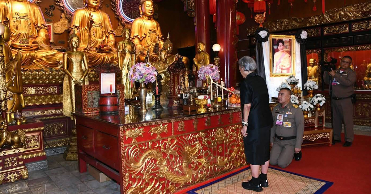 ทรงพระสุหร่าย ทรงเจิม พระป้ายบูรพาจารย์อดีตเจ้าอาวาสวัดมังกรกมลาวาสทุกรูป พระป้ายหลวงปู่ซ่งไต้ฮงโจวซือ สมโกชเปิดสักการะ 155 ปี และพระป้ายบูรพาจารย์พระสงฆ์ฝ่ายอินเดียและจีนบูรพาจาจารย์บรรพชิตจีนนิกายหลินจี้ และป้ายบิดามารดาผู้ให้กำเนิดบรรพชิตทุกรูปประเทศจีน (ปิดมา 120ปี) ทรงถวายผลไม้มงคล ทรงวางพวงมาลัย ทรงจุดธูปเทียนเครื่องนมัสการท้ายที่นั่ง ทรงคม เสด็จออกจากวิหารนาคบุษปะ (เล่งฮั้วตึ๊ง) แล้วเสด็จพระราชดำเนินกลับ