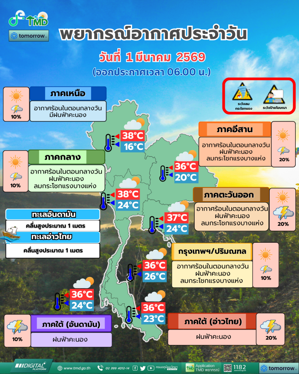 กรมอุตุนิยมวิทยา รายงาน ลักษณะอากาศทั่วไป ประจำวันที่ 01 มีนาคม 2569 พยากรณ์อากาศ 24 ชั่วโมงข้างหน้า ประเทศไทยตอนบนมีอากาศร้อนในตอนกลางวัน โดยมีฝนฟ้าคะนองและลมกระโชกแรงเกิดขึ้นได้บางพื้นที่บริเวณภาคกลางตอนล่าง รวมทั้งกรุงเทพมหานคร ภาคตะวันออก และภาคตะวันออกเฉียงเหนือ เนื่องจากมีลมใต้และลมตะวันตกเฉียงใต้พัดนำความชื้นเข้ามาปกคลุมบริเวณดังกล่าว ในขณะที่มีความกดอากาศต่ำเนื่องจากความร้อนปกคลุมประเทศไทยตอนบน ขอให้ประชาชนบริเวณดังกล่าวระวังอันตรายจากฝนฟ้าคะนองและลมกระโชกแรงที่จะเกิดขึ้น โดยหลีกเลี่ยงการอยู่ในที่โล่งแจ้ง ใต้ต้นไม้ใหญ่ สิ่งปลูกสร้าง และป้ายโฆษณาที่ไม่แข็งแรง รวมทั้งดูแลรักษาสุขภาพเนื่องจากสภาพอากาศที่เปลี่ยนแปลงไว้ด้วย สำหรับภาคใต้มีฝนฟ้าคะนองบางพื้นที่ เนื่องจากลมตะวันตกพัดปกคลุมทะเลอันดามัน ภาคใต้ และอ่าวไทย ส่วนบริเวณอ่าวไทยทะเลมีคลื่นสูงประมาณ 1 เมตร บริเวณที่มีฝนฟ้าคะนองคลื่นสูงมากกว่า 2 เมตร ขอให้ชาวเรือบริเวณอ่าวไทยและทะเลอันดามันเดินเรือด้วยความระมัดระวัง และหลีกเลี่ยงการเดินเรือในบริเวณที่มีฝนฟ้าคะนองไว้ด้วย