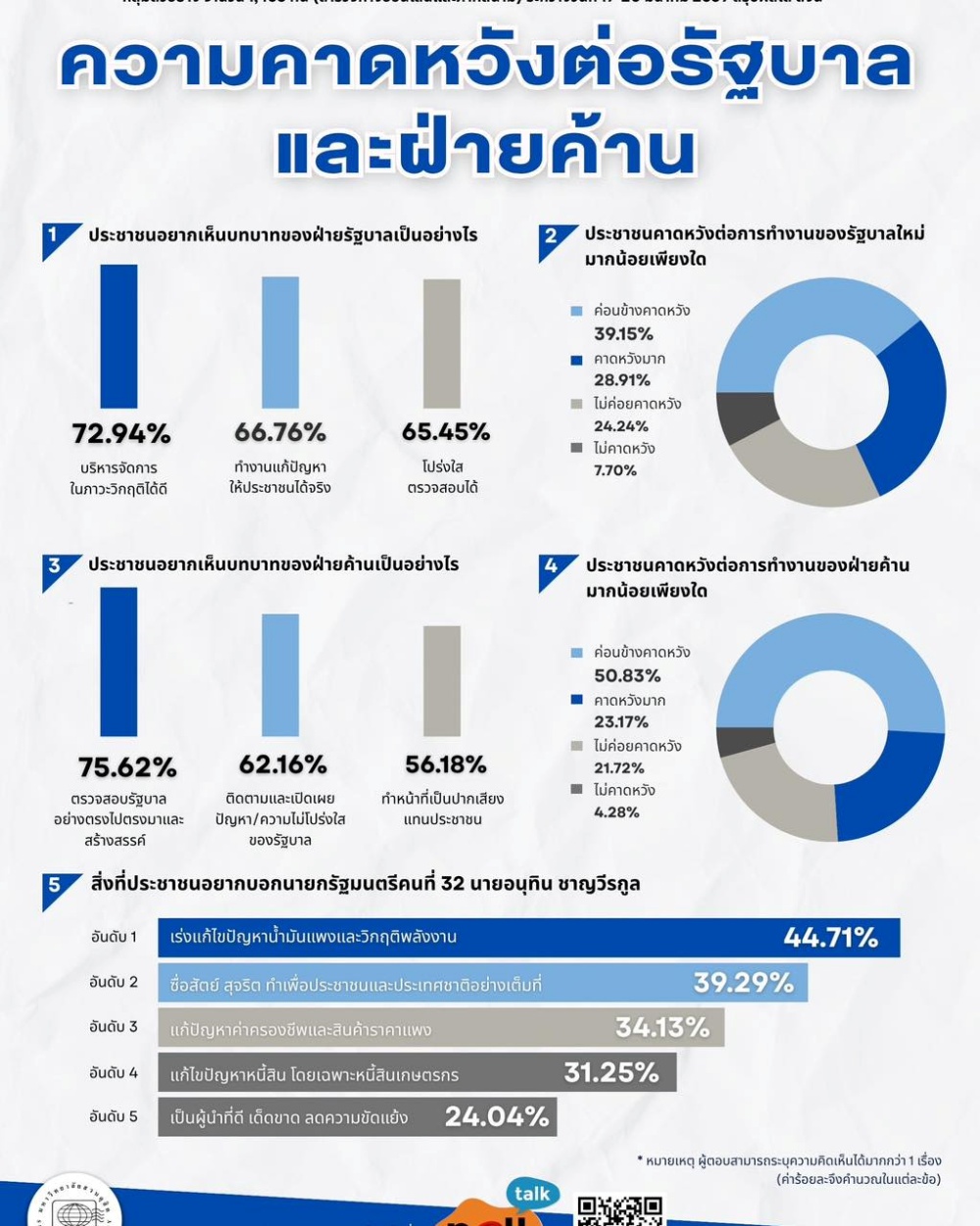 ผู้ช่วยศาสตราจารย์ยอดชาย ชุติกาโม อาจารย์ประจำหลักสูตรรัฐศาสตร์ โรงเรียนกฎหมายและการเมือง มหาวิทยาลัยสวนดุสิต อธิบายว่า จากการที่รัฐบาลชุดใหม่ภายใต้การนำของนายอนุทิน ชาญวีรกูล นายกรัฐมนตรีจากพรรคภูมิใจไทย เริ่มมีความชัดเจนมากขึ้นถึงตำแหน่งรัฐมนตรี และรัฐบาลใหม่จะต้องเผชิญกับวิกฤติการณ์ความขัดแย้งในตะวันออกกลางที่ส่อเค้าบานปลายออกไปเรื่อย ๆ และย่อมส่งผลกระทบต่อความเชื่อมั่นของรัฐบาล ทั้งนี้ประชาชนอยากเห็นบทบาทการบริหารจัดการในภาวะวิกฤติของรัฐบาลมากที่สุดถึง 72.94% ซึ่งต้องยอมรับว่ายากที่จะผ่านพ้นไปได้และความคาดหวังที่มีต่อรัฐบาลใหม่ ประชาชนมีความมั่นใจเพียง 39.15% ขณะที่ฝ่ายค้านประชาชนคาดหวังถึงบทบาทการตรวจสอบรัฐบาลอย่างตรงไปตรงมาและสร้างสรรค์ที่ต่างจากอดีตที่มักทำหน้าที่ฝ่ายแค้นและมุ่งทำลายรัฐบาลมากกว่าปัญหาจากการทำงาน โดยสิ่งที่ประชาชนต้องการบอกไปถึงนายกฯอนุทิน คือ “น้ำมันแพงและความกังวลต่อวิกฤติพลังงาน” ที่กระทบต่อประชาชนและรัฐบาลทั่วโลก สิ่งเหล่านี้กำลังกลายเป็นตัวแปรที่รัฐบาลพยายามควบคุมและใช้องคาพยพที่มีทั้งหมดในการแก้ไขปัญหา ซึ่งไม่มีใครคาดการณ์ได้ว่า สถานการณ์จะลุกลามหรือยืดเยื้อออกไปอีกนานเท่าใด เพราะนั่นหมายถึง อายุของรัฐบาลใหม่ที่กำลังจัดตั้งด้วย