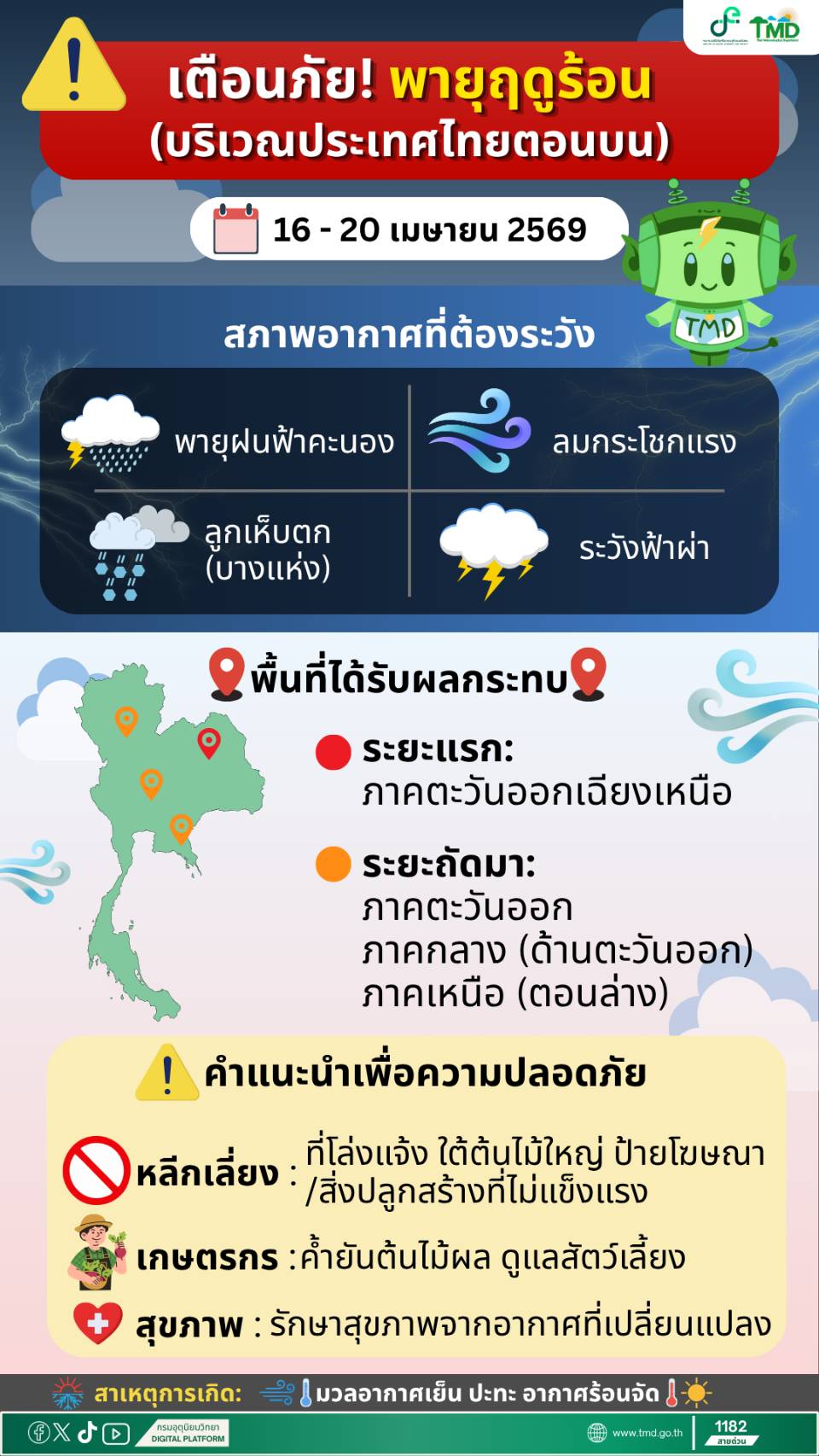 ประกาศระบุว่า ในช่วงเวลาดังกล่าวประเทศไทยตอนบนจะเกิดพายุฤดูร้อน โดยมีลักษณะเป็นพายุฝนฟ้าคะนอง ลมกระโชกแรง และอาจมีลูกเห็บตกบางแห่ง รวมถึงมีฟ้าผ่าเกิดขึ้นได้ในบางพื้นที่