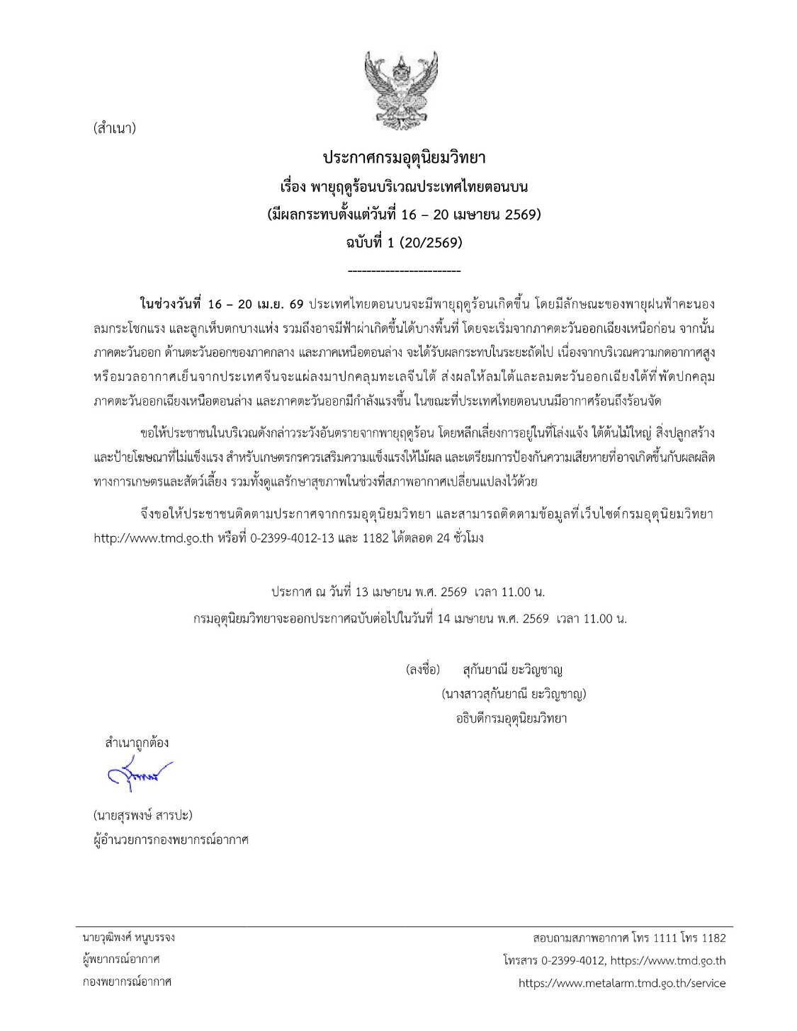 นางสาวสุกันยาณี ยะวิญชาญ อธิบดีกรมอุตุนิยมวิทยา ออกประกาศกรมอุตุนิยมวิทยา เรื่องพายุฤดูร้อนบริเวณประเทศไทยตอนบน ฉบับที่ 1 (20/2569) เตือนประชาชนรับมือสภาพอากาศแปรปรวนในช่วงวันที่ 16–20 เมษายน 2569