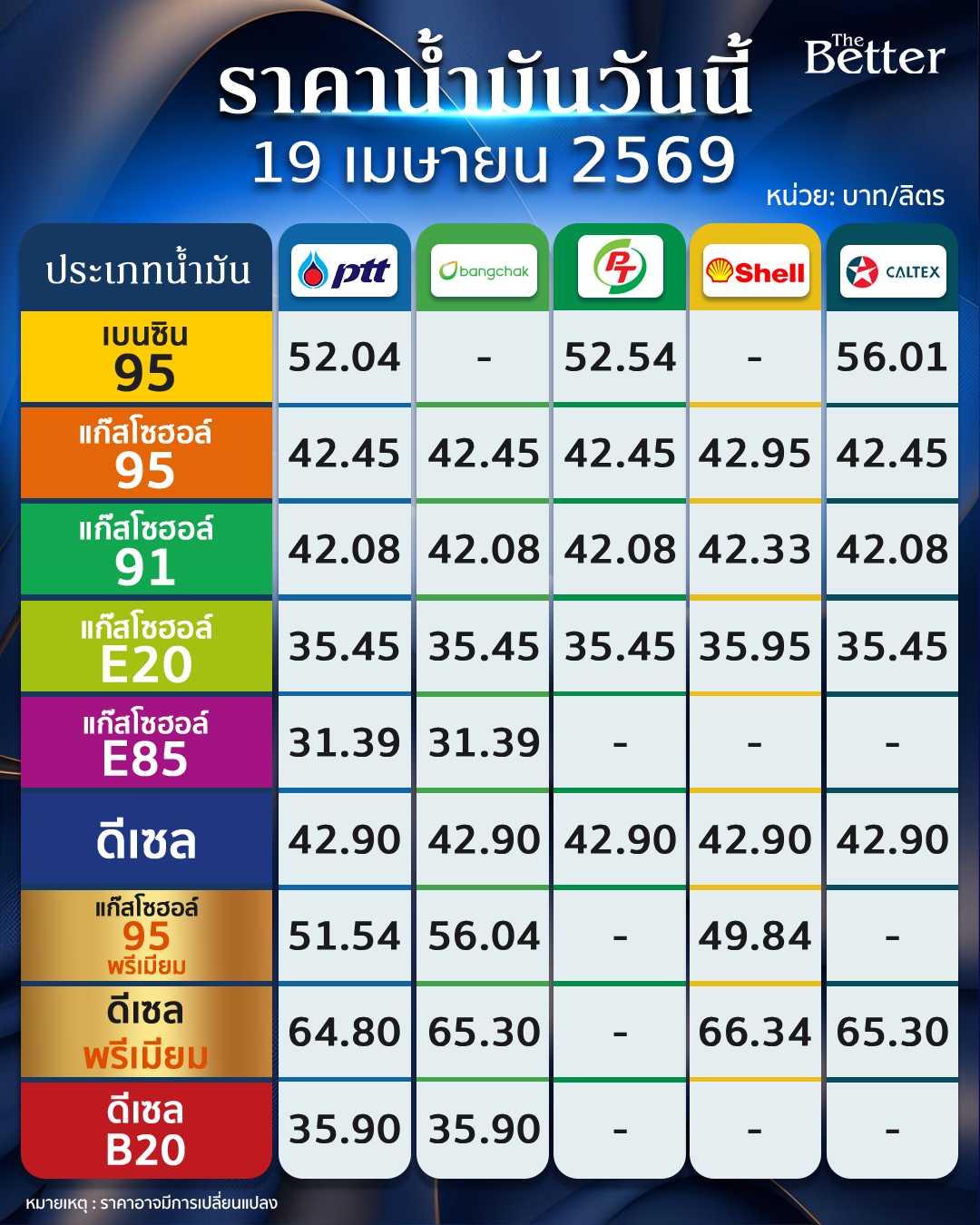 าคาน้ำมันวันนี้ 19 เม.ย.69 มีผลแล้ววันนี้ อัปเดต 5 สถานีบริการ น้ำมันดีเซล น้ำมันเบนซิน ลิตรละเท่าไร