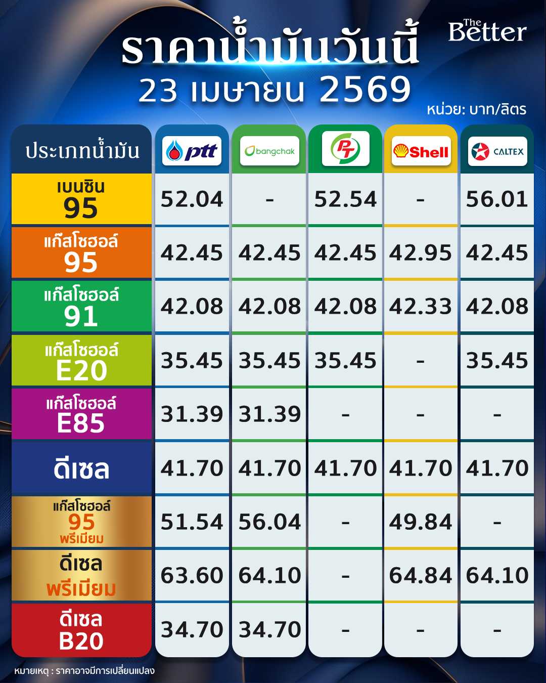 ราคาน้ำมันวันนี้ 23 เม.ย.69 มีผลแล้ววันนี้ อัปเดต 5 สถานีบริการ น้ำมันดีเซล น้ำมันเบนซิน ลิตรละเท่าไร