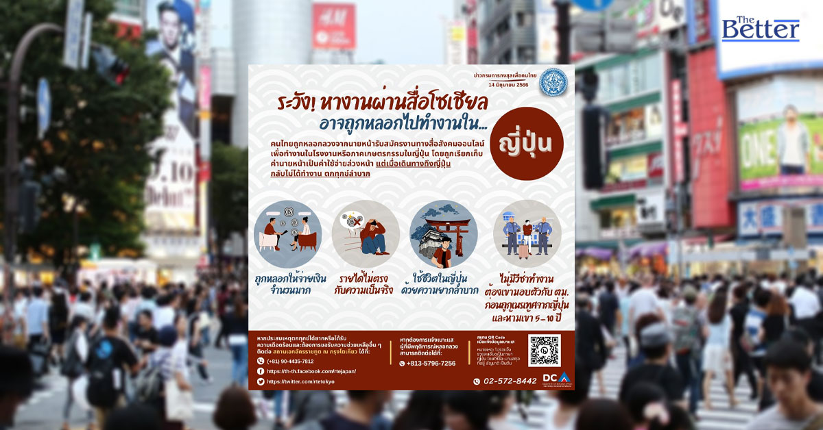วันที่ 16 มิ.ย. 2566 กระทรวงการต่างประเทศโดย กรมการกงสุล เตือนภัยผู้หางานผ่านสื่อโซเชียลมีเดียให้ระวังถูกนายหน้าหลอกไปทำงานที่ #ญี่ปุ่น หลังพบคนไทยถูกนายหน้าหลอกเปิดรับสมัครงานทางสื่อสังคมออนไลน์ ไปทำงานในโรงงานหรือภาคเกษตรกรรมที่ญี่ปุ่น โดยเรียกเก็บเงินค่านายหน้าล่วงหน้า แต่เมื่อเดินทางถึงญี่ปุ่นกลับไม่ได้ทำงาน ใช้ชีวิตอย่างลำบาก หรือรายได้ไม่ตรงกับความเป็นจริง และบางคนไม่มีวีซ่าทำงาน กรณีลักลอบเข้าไปทำงานที่ญี่ปุ่นโดยไม่มีวีซ่าทำงาน จะต้องเข้ามอบตัวกับตำรวจตรวจคนเข้าเมือง ก่อนถูกเนรเทศจากญี่ปุ่นและห้ามเข้าญี่ปุ่น 5-10 ปี
