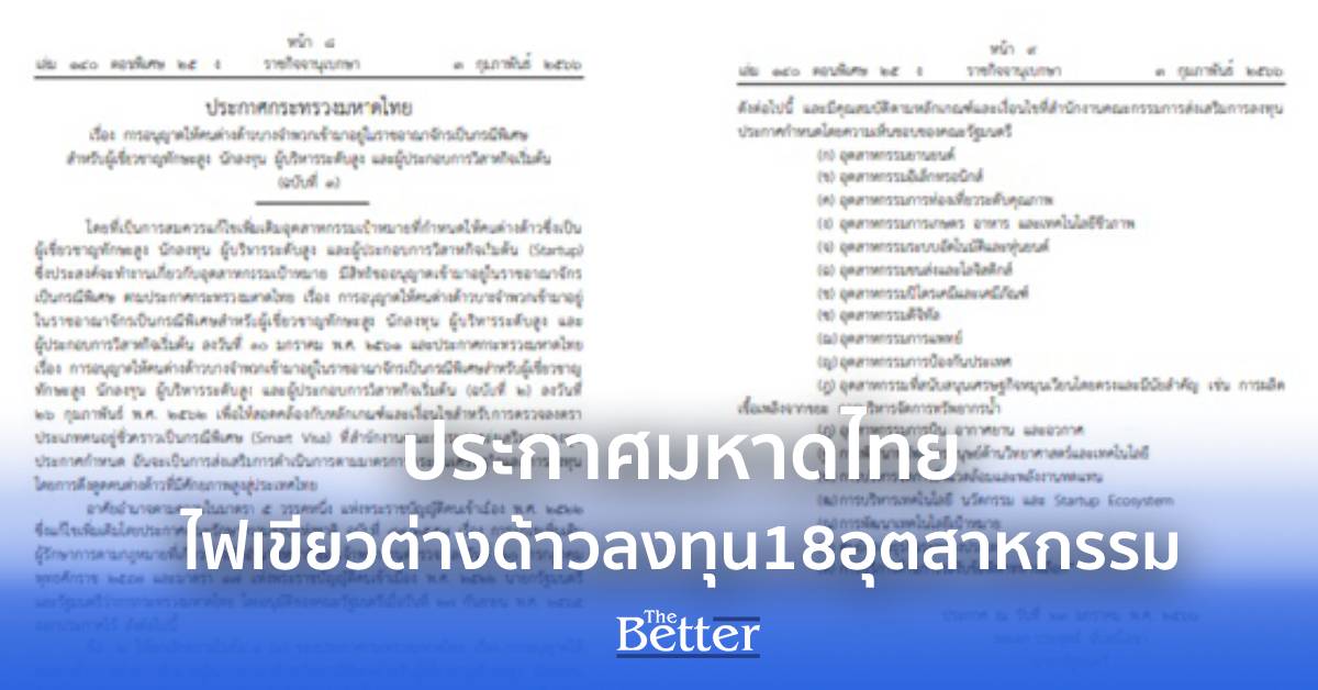 โดยที่เป็นการสมควรแก้ไขเพิ่มเติมอุตสาหกรรมเป้าหมายที่กำหนดให้คนต่างด้าวซึ่งเป็นผู้เชี่ยวชาญทักษะสูง นักลงทุน ผู้บริหารระดับสูง และผู้ประกอบการวิสาหกิจเริ่มต้น(Startup) ซึ่งประสงค์จะทำงานเกี่ยวกับอุตสาหกรรมเป้าหมาย มีสิทธิขออนุญาตเข้ามาอยู่ในราชอาณาจักรเป็นกรณีพิเศษ ตามประกาศกระทรวงมหาดไทย เรื่อง การอนุญาตให้คนต่างด้าวบางจำพวกเข้ามาอยู่ในราชอาณาจักรเป็นกรณีพิเศษสำหรับผู้เชี่ยวชาญทักษะสูง นักลงทุน ผู้บริหารระดับสูง และผู้ประกอบการวิสาหกิจเริ่มต้น ลงวันที่ 30 มกราคม พ.ศ. 2561 และประกาศกระทรวงมหาดไทย เรื่อง การอนุญาตให้คนต่างด้าวบางจำพวกเข้ามาอยู่ในราชอาณาจักรเป็นกรณีพิเศษสำหรับผู้เชี่ยวชาญทักษะสูง นักลงทุน ผู้บริหารระดับสูง และผู้ประกอบการวิสาหกิจเริ่มต้น (ฉบับที่ 2) ลงวันที่ 26 กุมภาพันธ์ พ.ศ. 2562