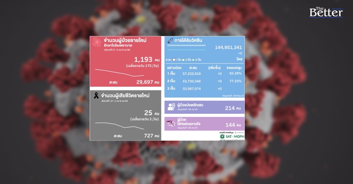 กรมควบคุมโรค กระทรวงสาธารณสุข รายงานสถานการณ์การแพร่ระบาดของโควิด-19 รายสัปดาห์ ว่า ระหว่างวันที่ 2 – 8 ก.ค. 2566 มีผู้ติดเชื้อรายใหม่ รักษาในโรงพยาบาล (รายสัปดาห์) 1,193 ราย เฉลี่ยวันละ 170 ราย ขณะที่มีผู้เสียชีวิตรายใหม่ (รายสัปดาห์) 25 ราย เฉลี่ยวันละ 3 ราย มีผู้ป่วยปอดอักเสบ 214 ราย และผู้ป่วยใส่เครื่องช่วยหายใจ 144 ราย