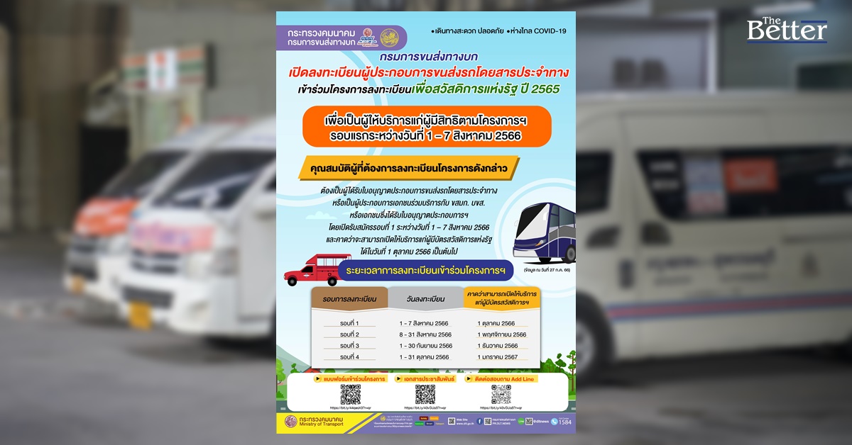กรมการขนส่งทางบก เปิดให้ผู้ประกอบการขนส่งด้วยรถโดยสารประจำทาง และเจ้าของรถร่วม ลงทะเบียนเป็น “ผู้ให้บริการ” ตามโครงการลงทะเบียนเพื่อสวัสดิการแห่งรัฐ ปี 2565 เริ่มรอบแรกวันที่ 1 – 7 ส.ค.66