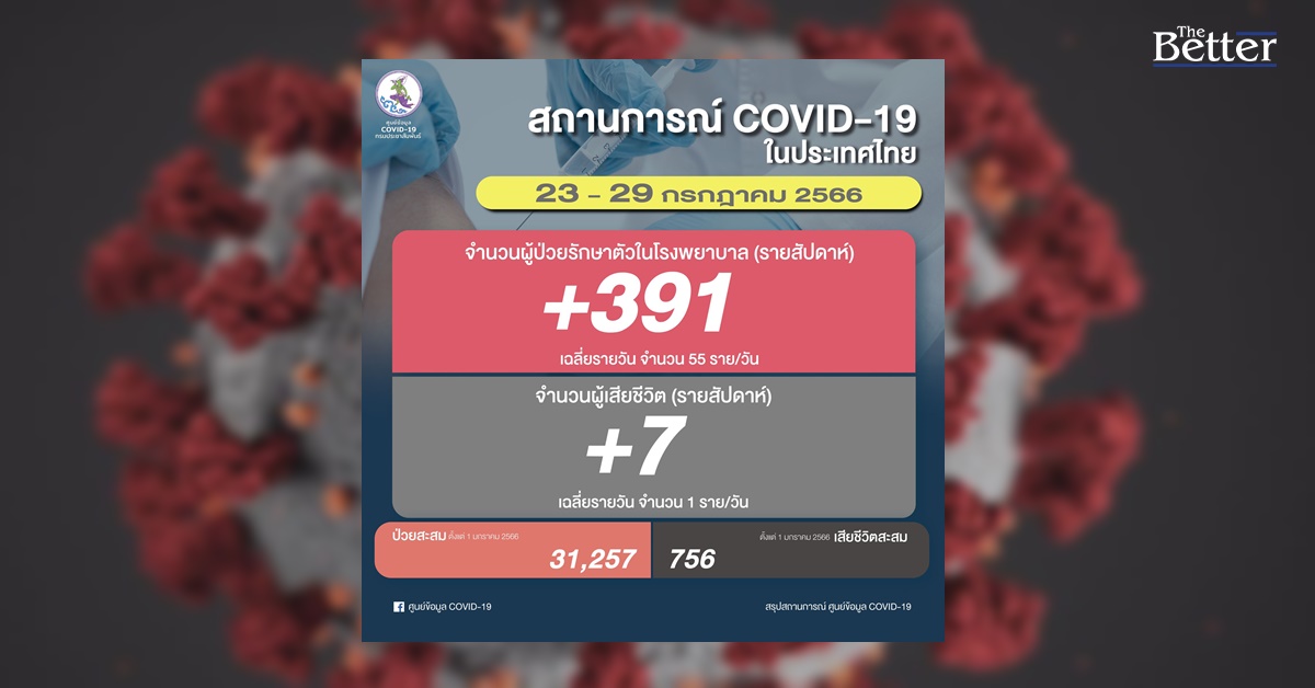 เพจเฟซบุ๊ก ศูนย์ข้อมูล COVID-19 รายงานสถานการณ์การแพร่ระบาดของโควิด-19 รายสัปดาห์ว่า ระหว่างวันที่ 23-29 กรกฎาคม 2566 ผู้ป่วยรักษาตัวในโรงพยาบาล (รายสัปดาห์) จำนวน 391 ราย : เฉลี่ยรายวัน จำนวน 55 ราย/วัน มีผู้เสียชีวิต (รายสัปดาห์)