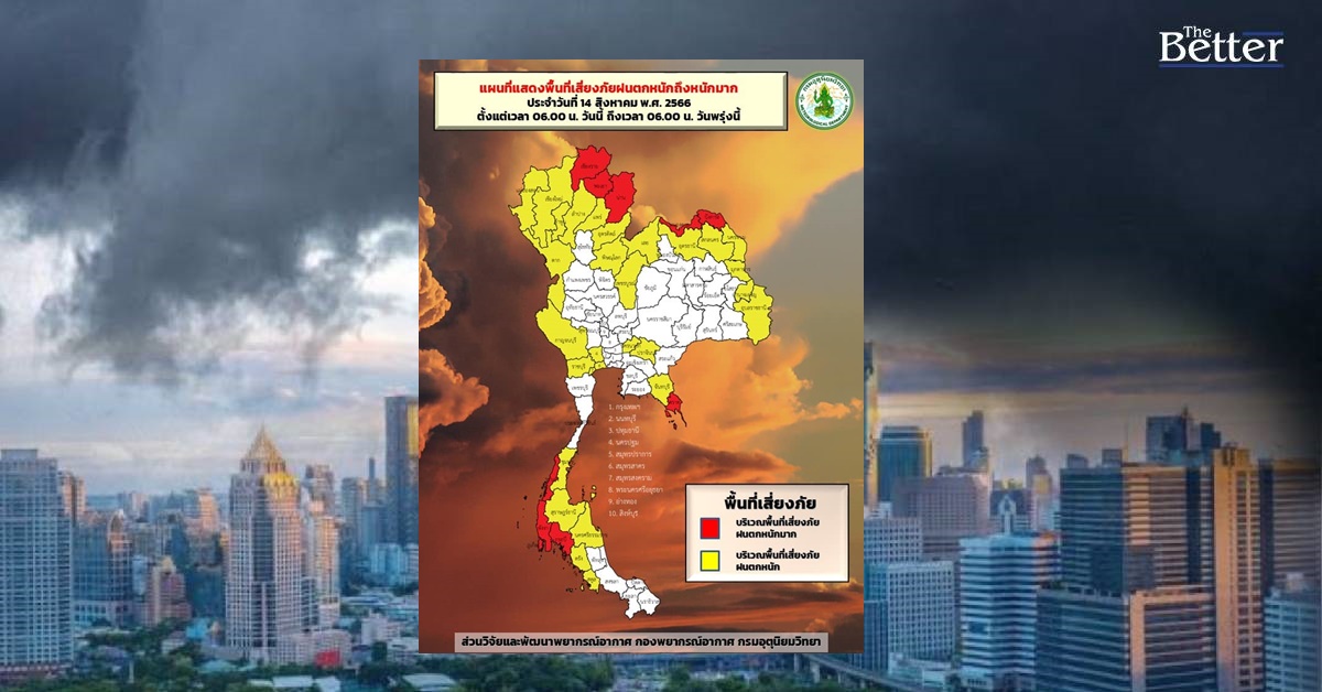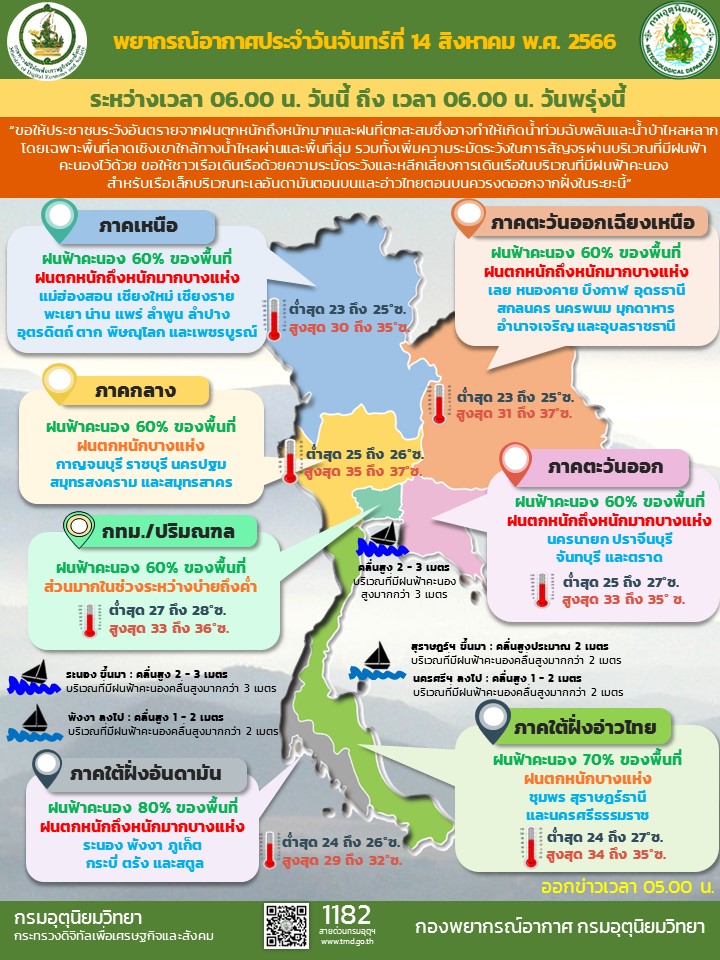กรมอุตุนิยมวิทยา รายงาน ลักษณะอากาศทั่วไป ประจำวันที่ 14 สิงหาคม 2566 พยากรณ์อากาศ 24 ชั่วโมงข้างหน้า มรสุมตะวันตกเฉียงใต้กำลังค่อนข้างแรงพัดปกคลุมทะเลอันดามัน ประเทศไทย และอ่าวไทย ประกอบกับร่องมรสุมพาดผ่านตอนบนของภาคเหนือ และประเทศลาวตอนบน เข้าสู่หย่อมความกดอากาศต่ำบริเวณประเทศเวียดนามตอนบนและอ่าวตังเกี๋ย ลักษณะเช่นนี้ทำให้ประเทศไทยมีฝนตกหนักบางแห่งในภาคกลาง และภาคใต้ฝั่งตะวันออก โดยมีฝนตกหนักมากบางพื้นที่ในภาคเหนือ ภาคตะวันออกเฉียงเหนือ ภาคตะวันออก และภาคใต้ฝั่งตะวันตก ขอให้ประชาชนในบริเวณดังกล่าวระวังอันตรายจากฝนตกหนักถึงหนักมากและฝนที่ตกสะสม ซึ่งอาจทำให้เกิดน้ำท่วมฉับพลันและน้ำป่าไหลหลาก โดยเฉพาะพื้นที่ลาดเชิงเขาใกล้ทางน้ำไหลผ่านและพื้นที่ลุ่ม รวมทั้งเพิ่มความระมัดระวังในการสัญจรผ่านบริเวณที่มีฝนฟ้าคะนองไว้ด้วย