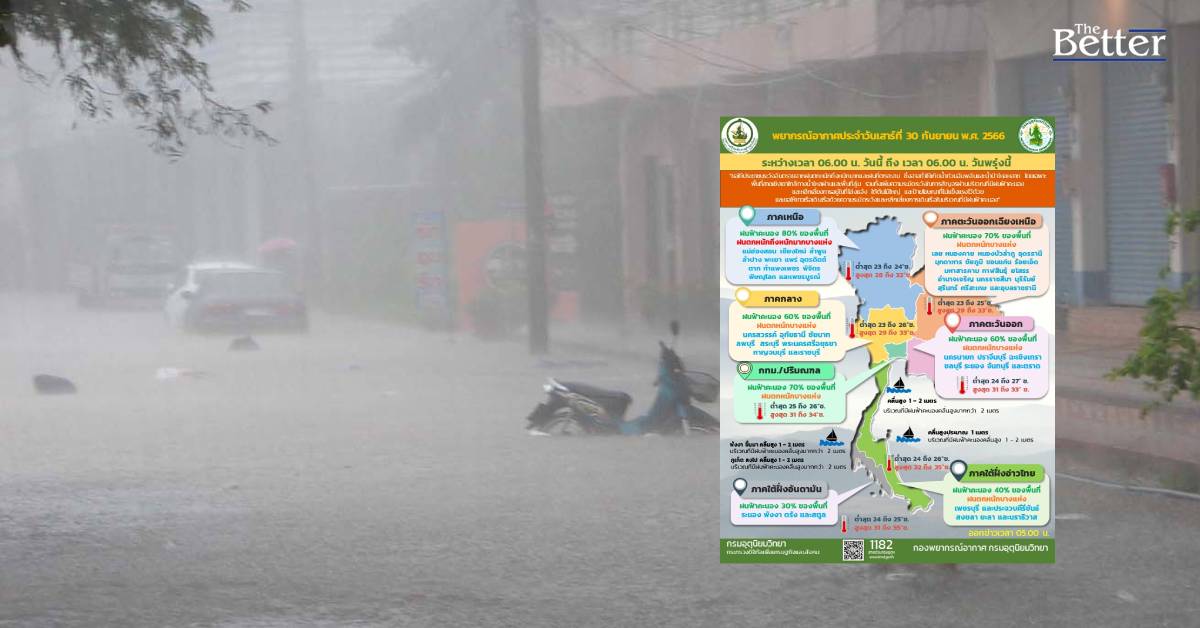กรมอุตุนิยมวิทยา รายงานการพยากรณ์อากาศ 24 ชั่วโมงข้างหน้า ร่องมรสุมพาดผ่านภาคเหนือตอนล่าง ภาคกลางตอนบน และภาคตะวันออกเฉียงเหนือ ประกอบกับมรสุมตะวันตกเฉียงใต้ที่พัดปกคลุมทะเลอันดามัน ภาคกลาง ภาคตะวันออก ภาคใต้ และอ่าวไทยเริ่มมีกำลังอ่อนลง ลักษณะเช่นนี้ยังคงทำให้มีฝนตกหนักบริเวณภาคตะวันออกเฉียงเหนือ ภาคกลางรวมทั้งกรุงเทพมหานครและปริมณฑล ภาคตะวันออก และภาคใต้ โดยมีฝนตกหนักมากบางแห่งบริเวณภาคเหนือ ขอให้ประชาชนในบริเวณดังกล่าวระวังอันตรายจากฝนตกหนักถึงหนักมากและฝนที่ตกสะสม ซึ่งอาจทำให้เกิดน้ำท่วมฉับพลันและน้ำป่าไหลหลาก โดยเฉพาะพื้นที่ลาดเชิงเขาใกล้ทางน้ำไหลผ่านและพื้นที่ลุ่ม รวมทั้งเพิ่มความระมัดระวังในการสัญจรผ่านบริเวณที่มีฝนฟ้าคะนองและหลีกเลี่ยงการอยู่ในที่โล่งแจ้ง ใต้ต้นไม้ใหญ่ และป้ายโฆษณาที่ไม่แข็งแรงไว้ด้วย