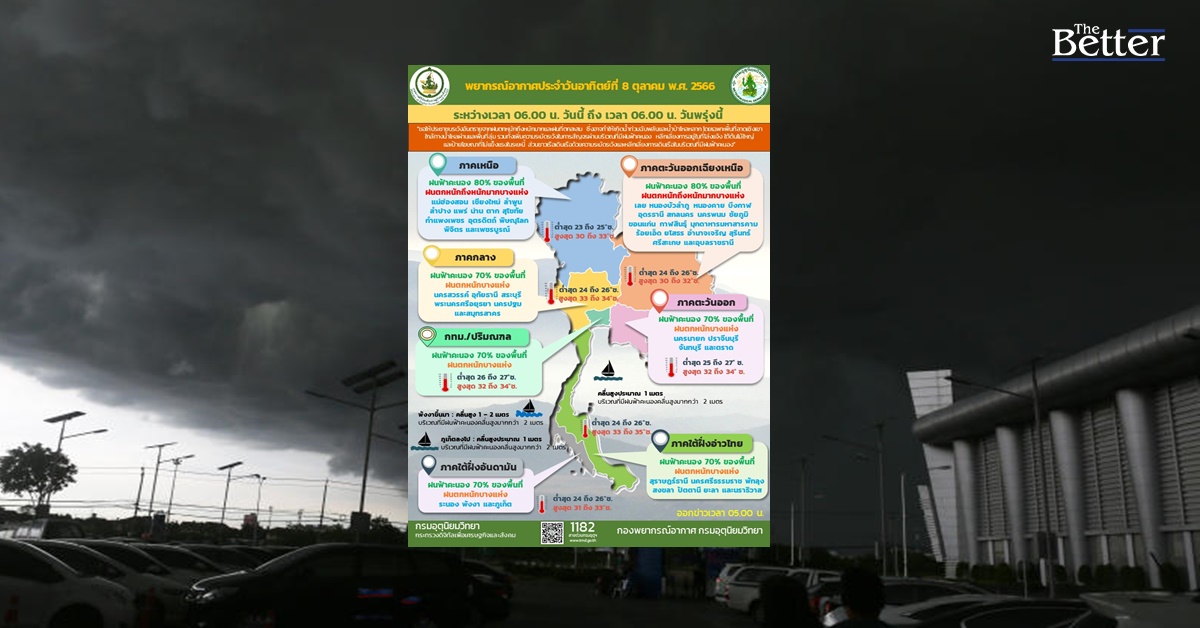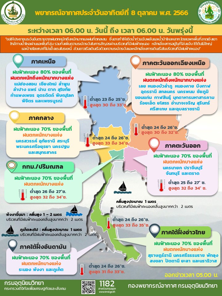 กรมอุตุนิยมวิทยา รายงาน ลักษณะอากาศทั่วไป ประจำวันที่ 08 ตุลาคม 2566 พยากรณ์อากาศ 24 ชั่วโมงข้างหน้า ร่องมรสุมพาดผ่านภาคเหนือ และภาคตะวันออกเฉียงเหนือ ในขณะที่มรสุมตะวันตกเฉียงใต้ยังคงพัดปกคลุมทะเลอันดามัน ประเทศไทย และอ่าวไทย ลักษณะเช่นนี้ทำให้ประเทศไทยมีฝนตกหนักบางแห่ง และมีฝนตกหนักมากบางพื้นที่ในภาคเหนือ และภาคตะวันออกเฉียงเหนือ ขอให้ประชาชนในบริเวณดังกล่าวระวังอันตรายจากฝนตกหนักถึงหนักมากและฝนที่ตกสะสม ซึ่งอาจทำให้เกิดน้ำท่วมฉับพลันและน้ำป่าไหลหลาก โดยเฉพาะพื้นที่ลาดเชิงเขาใกล้ทางน้ำไหลผ่านและพื้นที่ลุ่ม รวมทั้งเพิ่มความระมัดระวังในการสัญจรผ่านบริเวณที่มีฝนฟ้าคะนอง หลีกเลี่ยงการอยู่ในที่โล่งแจ้ง ใต้ต้นไม้ใหญ่ และป้ายโฆษณาที่ไม่แข็งแรงในระยะนี้