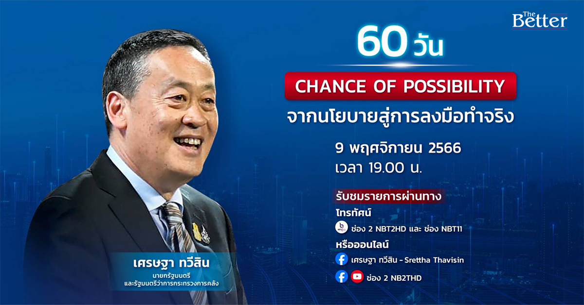 นายกฯ เตรียมโชว์ผลงาน 2 เดือนรัฐบาล ผ่านรายการ “Chance of Possibility จากนโยบายสู่การลงมือทำจริง 60 วัน ภายใต้รัฐบาลนายกฯ เศรษฐา ทวีสิน” 9 พ.ย.นี้