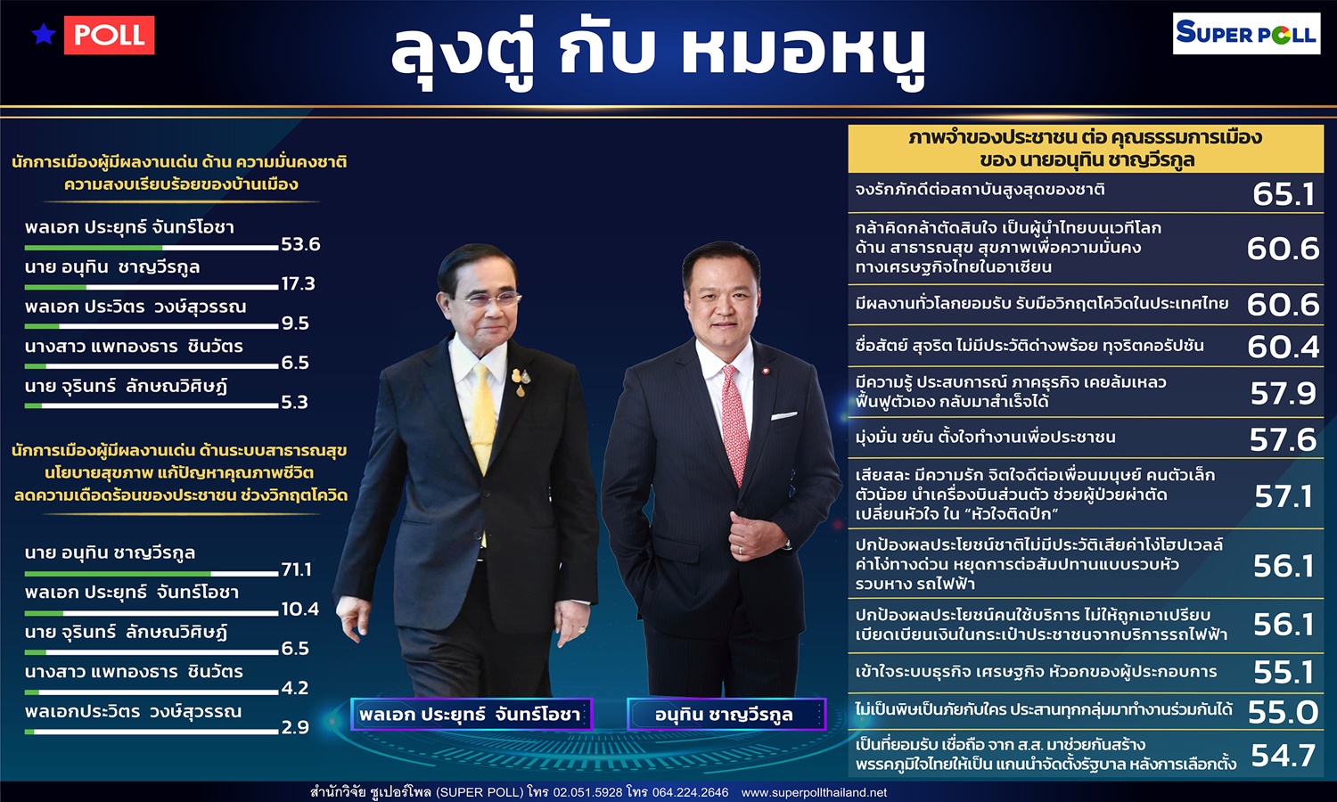 สำนักวิจัย ซูเปอร์โพล ระบุว่า ผลโพลชิ้นนี้ชี้ให้เห็นว่า จากผลโพลก่อนหน้านี้ที่เคยทำเรื่อง ลุงตู่ กับ คุณธรรมการเมืองพบว่ามีความเหมือนในบางด้านแต่หลายด้านที่แตกต่างกันไปจากภาพจำของประชาชนต่อคุณธรรมการเมืองของ หมอหนู หรือ นายอนุทิน ชาญวีรกูล เช่น ทั้ง ลุงตู่ และหมอหนู ต่างได้รับการยอมรับจากประชาชนเรื่องความจงรักภักดีและผลงานอันเป็นที่ยอมรับจากนานาประเทศทั่วโลกโดยเฉพาะผลงานด้านระบบสาธารณสุข นโยบายสุขภาวะของประชาชน สุขภาพเพื่อความมั่นคงทางเศรษฐกิจของประเทศในอาเซียน ความซื่อสัตย์สุจริตและความสามารถพลิกฟื้นวิกฤตที่เคยเกิดกับธุรกิจของตัวเองจนประสบความสำเร็จเจริญมั่งคง จึงได้รับการโหวตจากประชาชนในความสำเร็จที่สามารถฟันฝ่าปัญหาธุรกิจในยามวิกฤตเศรษฐกิจของประเทศ เข้าใจหัวอกของผู้ประกอบการและความเดือดร้อนของประชาชน นอกจากนี้ ที่โดดเด่นในลักษณะคุณธรรมของนายอนุทิน ชาญวีรกูลที่ลงมือปฏิบัติด้วยตนเองตั้งแต่ก่อนการทำงานทางการเมืองคือ เสียสละ มีความรัก จิตใจดีต่อเพื่อนมนุษย์ คนตัวเล็กตัวน้อย นำเครื่องบินส่วนตัว ช่วยผู้ป่วยผ่าตัดเปลี่ยนหัวใจ ใน “หัวใจติดปีก”