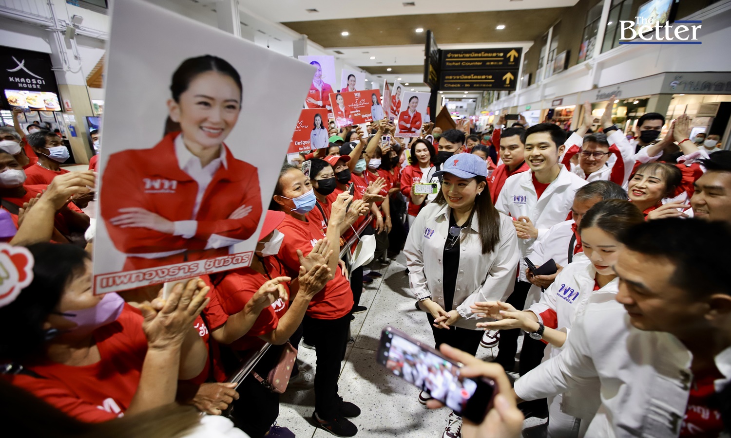 ทันทีที่ น.ส.แพทองธาร พร้อมคณะเดินทางออกจากอาคารผู้โดยสารขาออก ประชาชนส่งเสียงเชียร์ดังสนั่นว่า “แลนด์สไลด์ ครอบครัวเพื่อไทย” พร้อมทั้งมอบดอกไม้ให้กับ น.ส.แพทองธารและคณะ