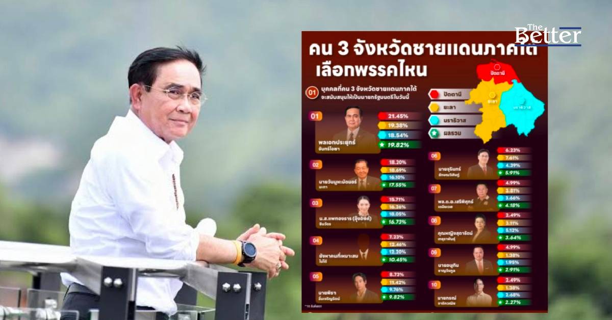 จากการสำรวจเมื่อถามถึงบุคคลที่คนสามจังหวัดชายแดนภาคใต้จะสนับสนุนให้เป็นนายกรัฐมนตรีในวันนี้ พบว่า