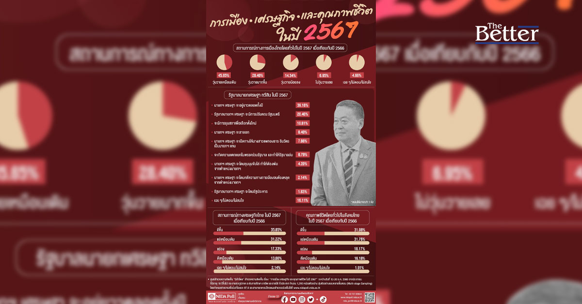 นิด้าโพล เผยผลสำรวจ ประชาชนเชื่อรัฐบาล "เศรษฐา" อยู่ยาวตลอดปี เศรษฐกิจ - คุณภาพชีวิต จะดีขึ้น