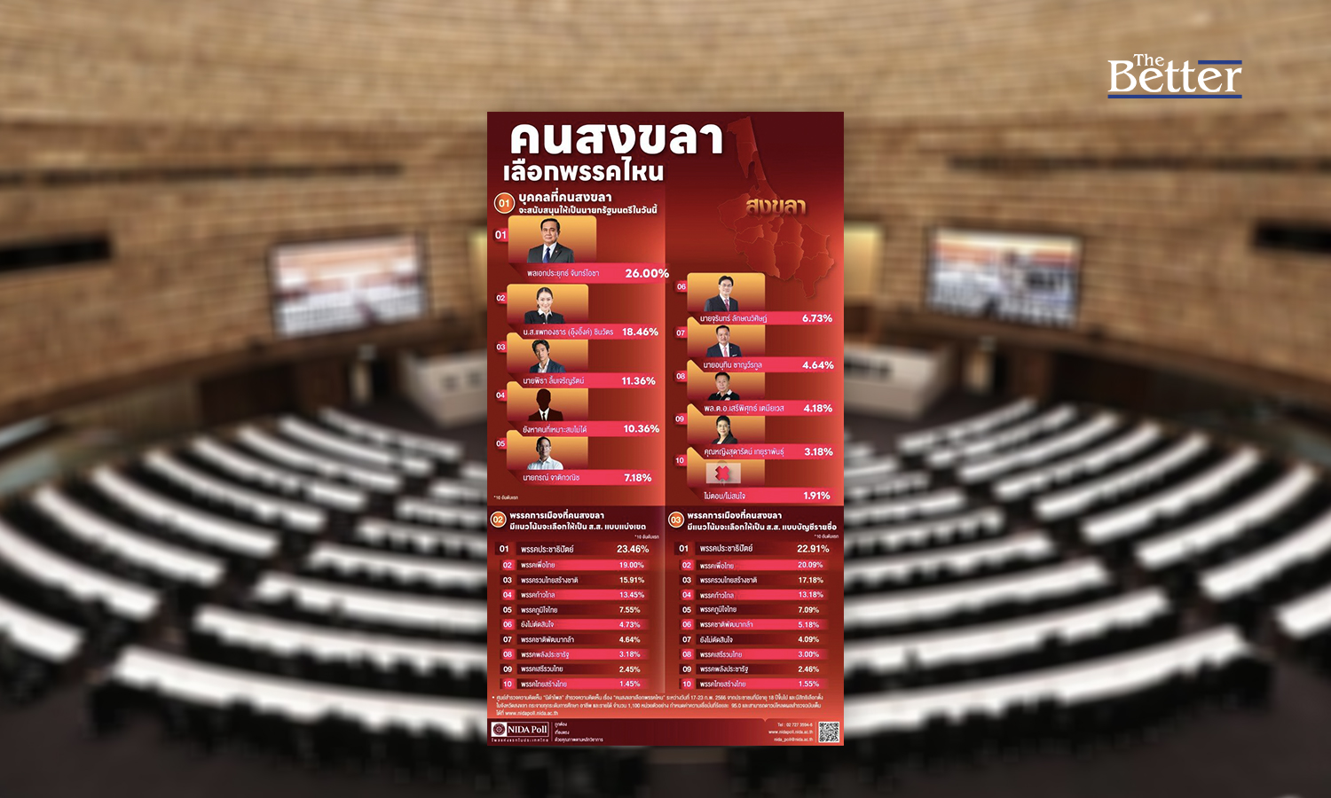เมื่อวันที่ 5 มีนาคม "นิด้าโพล" สถาบันบัณฑิตพัฒนบริหารศาสตร์ (นิด้า) เปิดเผยผลสำรวจของประชาชน เรื่อง “คนสงขลาเลือกพรรคไหน” ทำการสำรวจระหว่างวันที่ 17-23 กุมภาพันธ์ 2566 จากประชาชนที่มีอายุ 18 ปีขึ้นไป และมีสิทธิเลือกตั้งในจังหวัดสงขลา