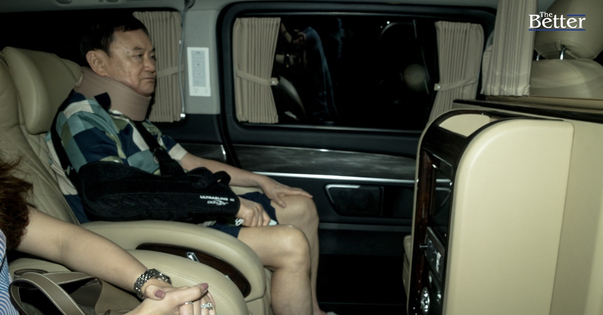 โดยนายทักษิณกับบุตรสาวทั้งสองคน นั่งรถตู้เบนซ์ สีดำ ทะเบียน ภษ 1414 ออกมาจากอาคารคารมหาภูมิพลราชานุสรณ์ 88 พรรษา โรงพยาบาลตำรวจ พร้อมกับรถติดตาม รวมทั้งหมด 4 คัน ซึ่งนายทักษิณนั่งฝั่งซ้ายของรถ สวมเสื้อเชิ้ตแขนสั้นใส่กางเกงขาสั้น สวมหน้ากากอนามัย พร้อมสวมเฝือกอ่อนที่คอ และใส่เฝือกสีดำที่แขนขวา ส่วนนางสาวแพทองธารนั่งฝั่งขวา ขณะที่นางสาวพินทองทานั่งด้านหลัง