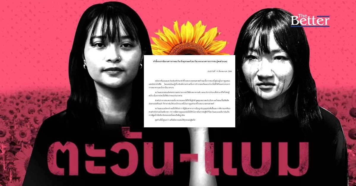 "ตะวัน-แบม" ประกาศเลิกอดอาหาร พร้อมยอมรับการรักษาเพื่อเอาชีวิตสู้ต่อไป เหตุยังไม่ได้รับการตอบรับจากศาล