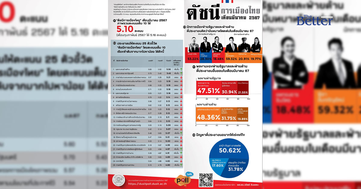“สวนดุสิตโพล” มหาวิทยาลัยสวนดุสิต สำรวจความคิดเห็นประชาชนทั่วประเทศ เรื่อง “ดัชนีการเมืองไทย ประจำเดือนมีนาคม 2567” กลุ่มตัวอย่าง จำนวน 2,254 คน (สำรวจทางออนไลน์และภาคสนาม) ระหว่างวันที่ 21-29 มีนาคม 2567 โดยมีตัวชี้วัด 25 ประเด็นที่บ่งบอกถึงความเชื่อมั่นต่อการเมืองไทยในด้านต่าง ๆ ซึ่งแต่ละตัวชี้วัดจะมีคะแนนเต็ม 10 คะแนน สรุปผลเรียงลำดับจากค่าคะแนนสูงสุดไปถึงต่ำสุด ได้ดังนี้