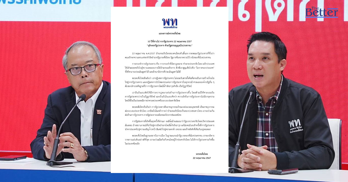 “เพื่อไทย” ร่อนแถลงการณ์ แสดงจุดยืน 10 ปี รัฐประหาร ชี้ ศาลต้องไม่ยอมรับ คนยึดอำนาจ เป็นรัฏฐาธิปัตย์ เร่งแก้รธน.ฉบับประชาชน พ่วงกฏหมายต่อต้านรัฐประหารให้เสร็จภายในรัฐบาลเพื่อไทย