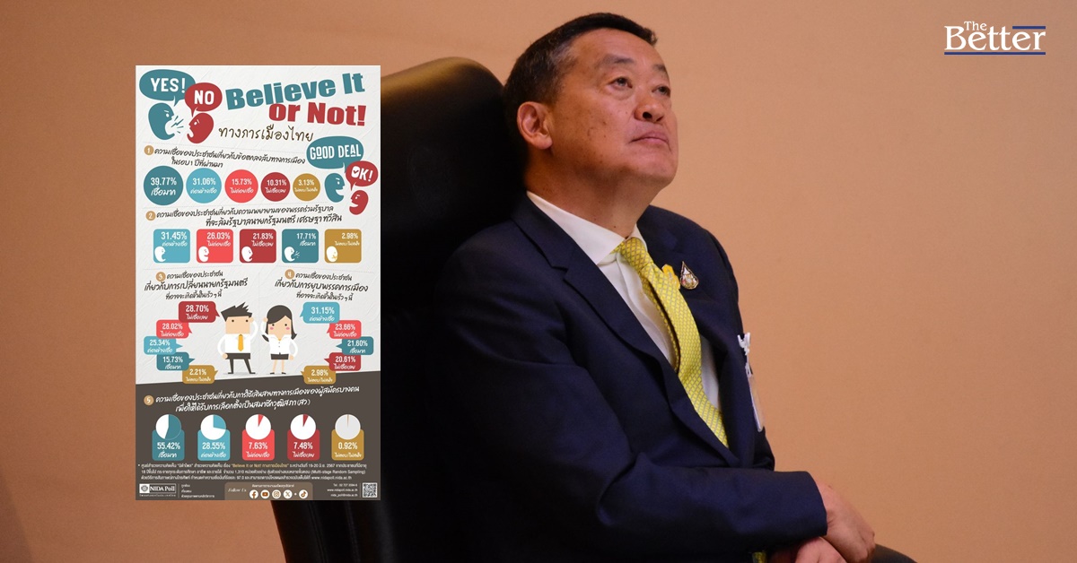 ศูนย์สำรวจความคิดเห็น “นิด้าโพล” สถาบันบัณฑิตพัฒนบริหารศาสตร์ (นิด้า) เปิดเผยผลการสำรวจของประชาชน เรื่อง “Believe It or Not! ทางการเมืองไทย” ทำการสำรวจระหว่างวันที่ 19-20 มิถุนายน 2567 จากประชาชนที่มีอายุ 18 ปีขึ้นไป กระจายทุกภูมิภาค ระดับการศึกษา อาชีพ และรายได้ ทั่วประเทศ รวมทั้งสิ้น จำนวน 1,310 หน่วยตัวอย่าง เกี่ยวกับความเชื่อของประชาชนเกี่ยวกับสถานการณ์ทางการเมืองของประเทศไทย การสำรวจอาศัยการสุ่มตัวอย่างโดยใช้ความน่าจะเป็นจากบัญชีรายชื่อฐานข้อมูลตัวอย่างหลัก (Master Sample) ของ “นิด้าโพล” สุ่มตัวอย่างแบบหลายขั้นตอน (Multi-stage Sampling) เก็บข้อมูลด้วยวิธีการสัมภาษณ์ทางโทรศัพท์ โดยกำหนดค่าความเชื่อมั่น ร้อยละ 97.0