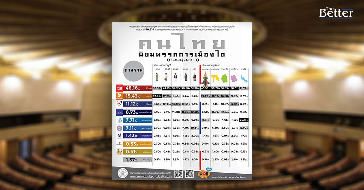 เมื่อจำแนกตามอายุ พบว่า กลุ่มอายุ 18 – 30 ปี นิยมพรรคก้าวไกลมากที่สุด ร้อยละ 37.85 ส่วนกลุ่มอายุ อื่น ๆ นิยมพรรคเพื่อไทยมากที่สุด เมื่อจำแนกตามภูมิภาค พบว่า กรุงเทพฯ ภาคกลาง ภาคเหนือ และภาคตะวันออกเฉียงเหนือนิยมพรรคเพื่อไทยมากที่สุด ส่วนภาคใต้นิยมพรรคประชาธิปัตย์มากที่สุด ร้อยละ 24.71 ตามมาด้วยพรรคเพื่อไทย ร้อยละ 21.72