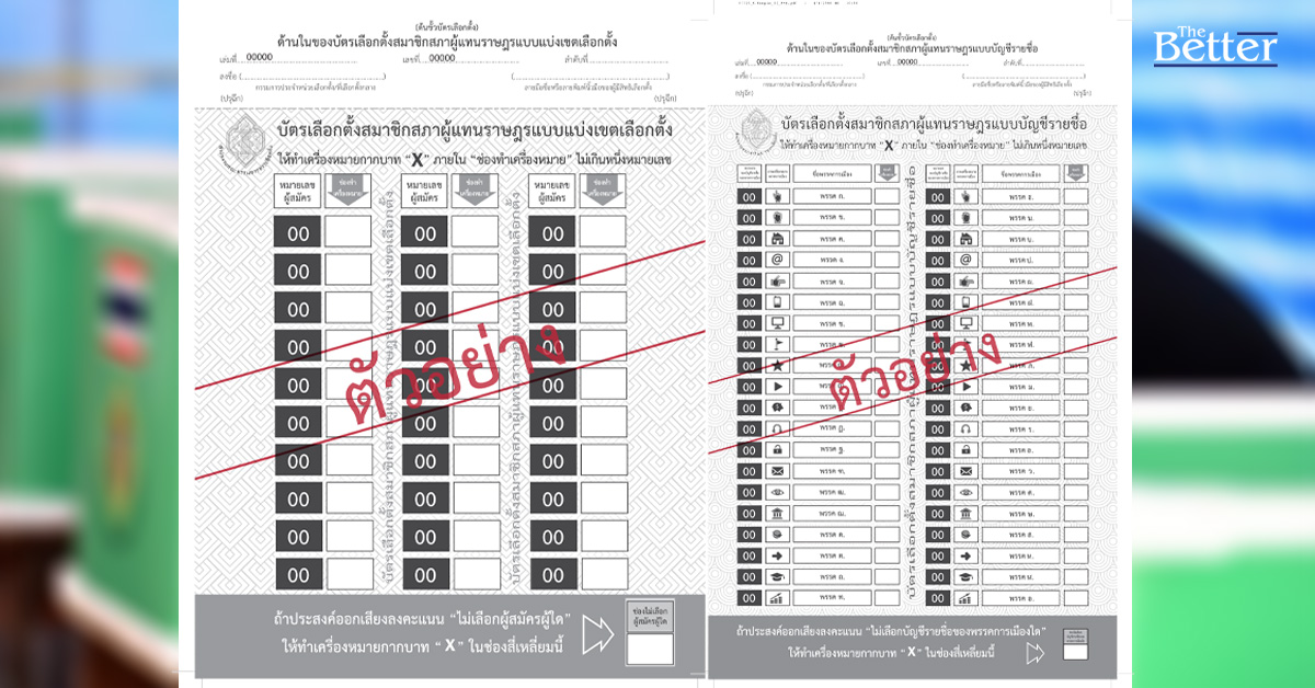 กกต.เผยตัวอย่างบัตรเลือกตั้ง 14 พ.ค.ทั้งสองระบบพบบัตรเลือกตั้งแบบแบ่งเขตมีแต่เบอร์ไม่มีชื่อพรรคขณะที่บัตรปาร์ตี้ลิสต์ มีโลโก้ เบอร์ ชื่อพรรคครบ