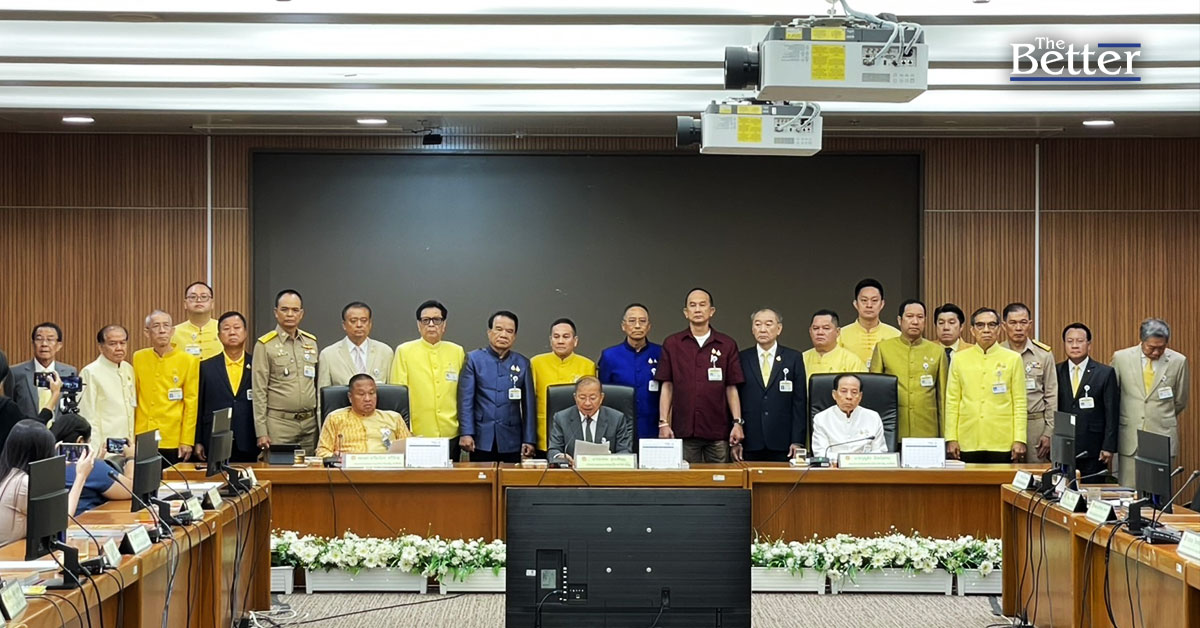 นายมงคล สุระสัจจะ ประธานวุฒิสภา พร้อมด้วยพล.อ.เกรียงไกร ศรีรักษ์ รองประธานวุฒิสภา คนที่ 1 และนายบุญส่ง น้อยโสภณ รองประธานวุฒิสภา คนที่ 2 นำทีม สว.แถลงข่าวกรณีการฮั้วเลือก สว. ณ อาคารรัฐสภา