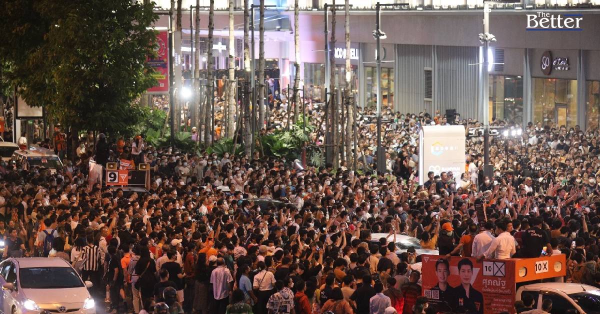 ประชาชนแห่ฟัง "ก้าวไกล" ปราศัยใหญ่ที่สามย่านมิตรทาวน์ เก้าอี้เต็มคนแน่นล้นถนน