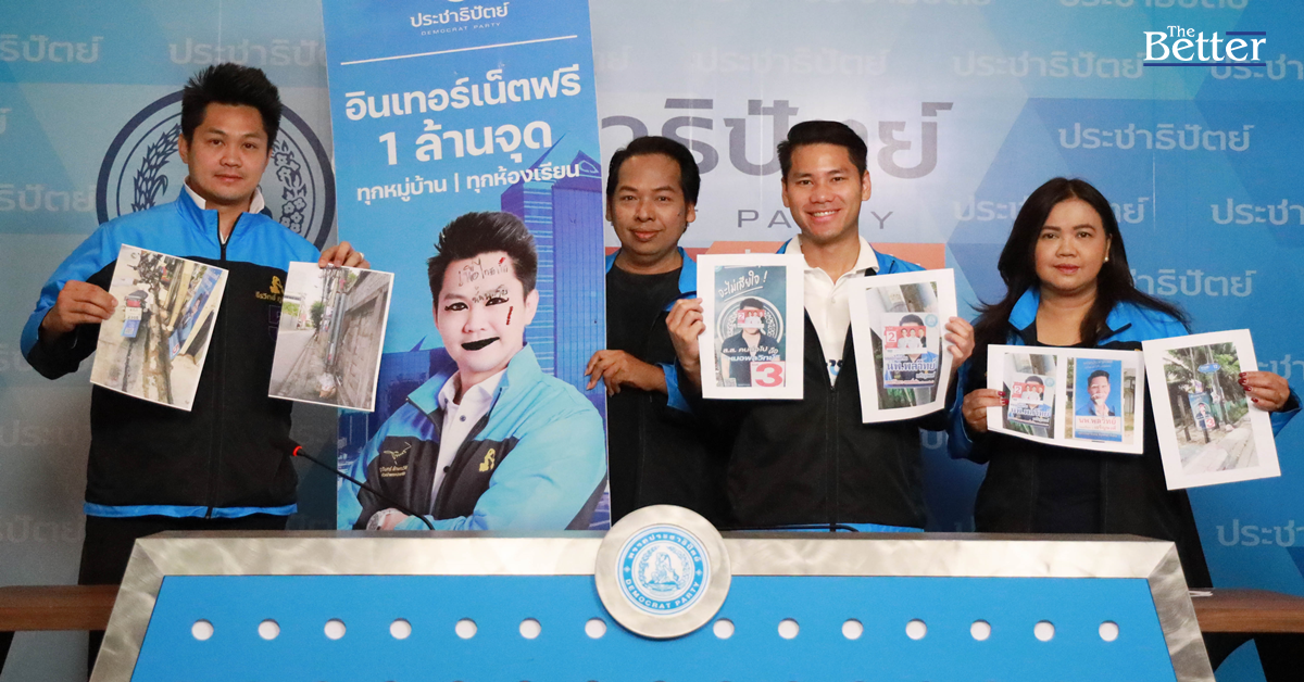 ส่วนที่พรรคประชาธิปัตย์ในวันนี้ นางดรุณวรรณ ชาญพิพัฒนชัย พร้อมด้วยนายจิตกร บุษบา ทีมโฆษกศูนย์อำนวยการเลือกตั้ง พรรคประชาธิปัตย์ ร่วมกันแถลงข่าว ว่าขณะนี้ในภาพรวมยังพบการทำลายป้ายหาเสียงของพรรคในเขตกรุงเทพมหานคร บางพื้นที่โดนเก็บและนำป้ายของผู้สมัครของพรรคอื่นมาติดตั้งแทน โดยเฉพาะพื้นที่ของผู้สมัครหน้าใหม่ ถือเป็นบรรยากาศการหาเสียงที่ไม่สร้างสรรค์ และที่สำคัญเป็นการทำผิดกฎหมายอาญา