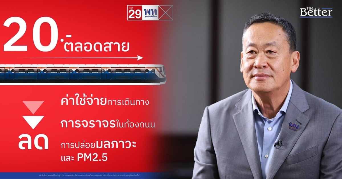 ผมและพรรคเพื่อไทยมองว่ารถไฟฟ้าควรเป็นสิทธิ์ขั้นพื้นฐานที่ประชาชนชาวไทยทุกคนสามารถเข้าถึงได้ เราจึงมีความตั้งใจที่จะทำให้ราคาค่ารถไฟฟ้าลดลงอย่างมีนัยยะสำคัญ โดยเราจะเร่งเจรจากับทุกภาคส่วนเพื่อลดค่าโดยสารลงให้เหลือ 20 บาทตลอดสาย ซึ่งเป็นอัตราขั้นต่ำที่เข้าถึงได้ และเป็นสิ่งที่ประเทศที่พัฒนาแล้ว (เช่น ฝรั่งเศส) ทำมานานแล้ว
