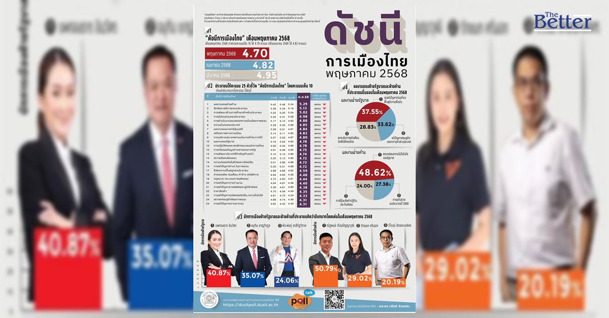 สวนดุสิตโพล มหาวิทยาลัยสวนดุสิต สำรวจความคิดเห็นประชาชนทั่วประเทศ เรื่อง “ดัชนีการเมืองไทย ประจำเดือนพฤษภาคม 2568” กลุ่มตัวอย่าง จำนวน 2,168 คน (สำรวจทางออนไลน์และภาคสนาม) ระหว่างวันที่ 26-30 พฤษภาคม2568 พบว่า กลุ่มตัวอย่างให้คะแนนภาพรวมดัชนีการเมืองไทยประจำเดือนพฤษภาคม 2568 เฉลี่ย 4.70 คะแนน ลดลงจากเดือนเมษายน 2568 ที่ได้ 4.82 คะแนน